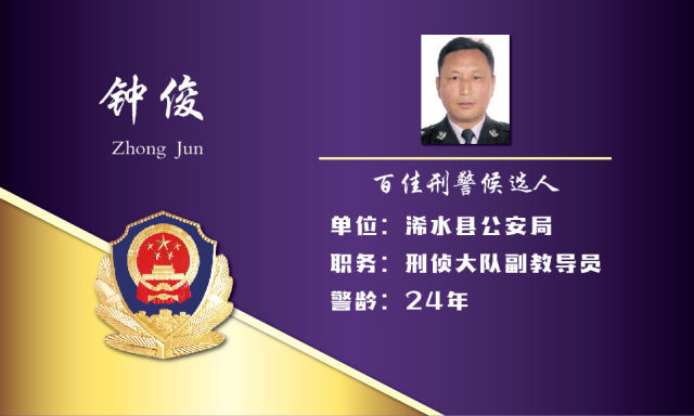 从警24年来,钟俊先后荣立一等功一次,二等功一次,三等功三次。2017年5月被授予“全国特级优秀人民警察”荣誉称号。