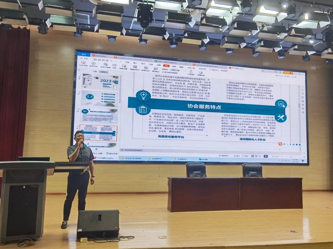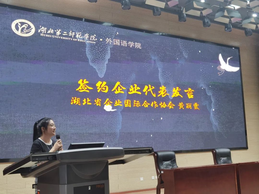 在签约仪式上,秘书长黄丽霞作为代表发言,她介绍了湖北省企业国际合作协会的历史,并希望能跟湖北第二师范学院共同培养出优秀的毕业生。随后,湖北第二师范学院外国语学院聘请秘书长黄丽霞为行业导师,并颁发聘书。