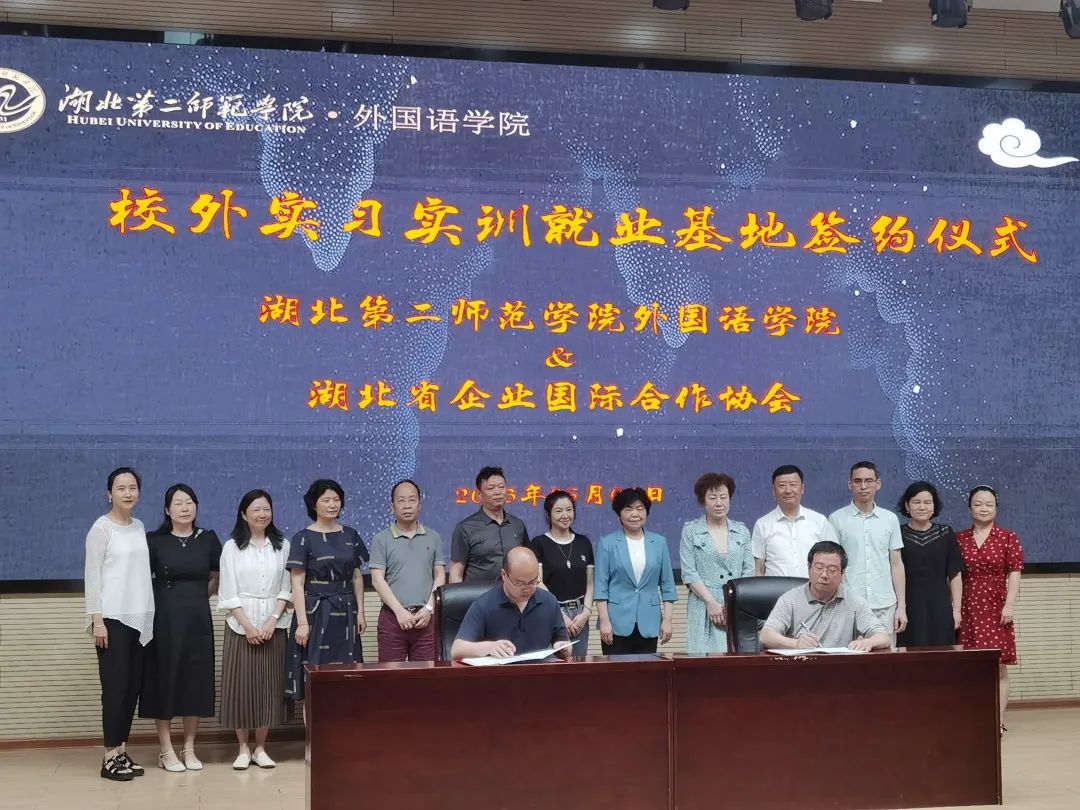 湖北省企业国际合作协会与湖北省第二师范学院外国语学院举行校外实习实训就业基地签约仪式。参加签约的还有武汉赛恩斯国际物流有限公司、无锡格瑞教育科技集团有限公司、武汉香海教育科技有限公司、湖北小语教育科技有限公司等四家企业。
