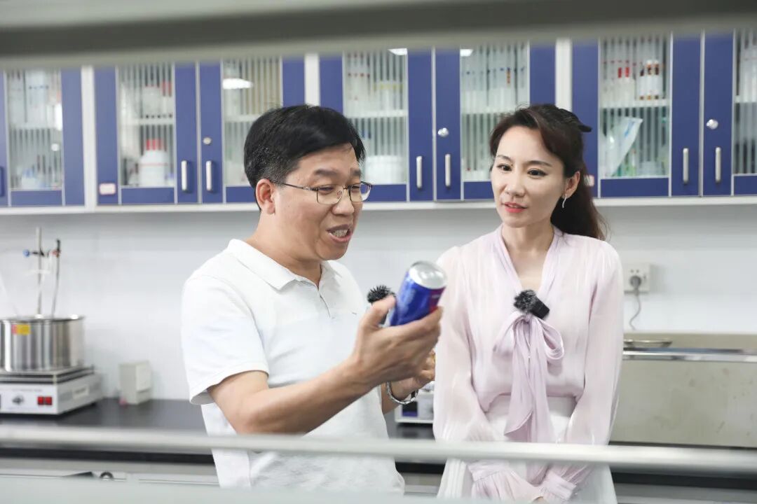 在中医药微生物组与营养代谢研究所内,湖北“师德先进个人”、基础医学院刘洪涛教授正在展示团队研发的多款功能食品和检测装置。