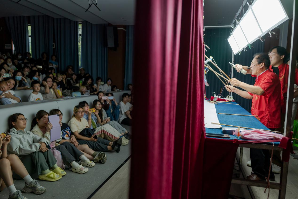 互动环节,耿纪朋教授引导在场学生分批次体验亲手操控皮影人走位、翻转、打斗、配乐、拟声等基本功,让同学们现场感受传统文化的独特魅力,在他们心中播下诚信友爱、智慧善良、坚韧勇敢的种子。