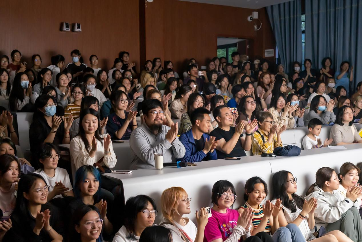 表演余尾,满头大汗的秦礼刚拿着正反角色的两个皮影人从幕后走向幕前,结合自身成长与演出经历向师生介绍国家级非遗项目云梦皮影,以及为皮影传承创新和对外文化交流方面作出的努力,道出了他人生在戏里,戏里有人生的真切体悟。秦礼刚还勉励青年大学生们,要坚定文化自信,勇敢站出来,自觉坚守住祖辈们留下来的技艺绝活,做时代迭变与代际转型中连接传统之美的新生代,让皮影戏焕发新生机。