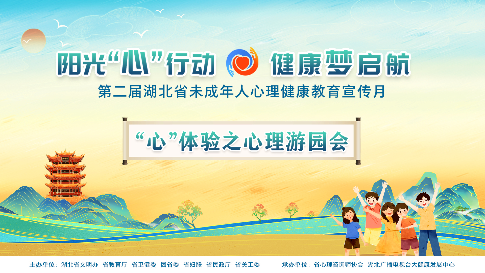 亲爱的孩子们、家长们,六一儿童节即将来临,在这个特殊的日子里,由湖北省文明办、省教育厅、省卫健委、团省委、省妇联、省民政厅、省关工委主办,省心理咨询师协会、湖北广播电视台大健康发展中心承办的心理游园活动开园啦,特邀大家一起走进爱与关怀的乐园,共同探索心灵成长的奥秘!