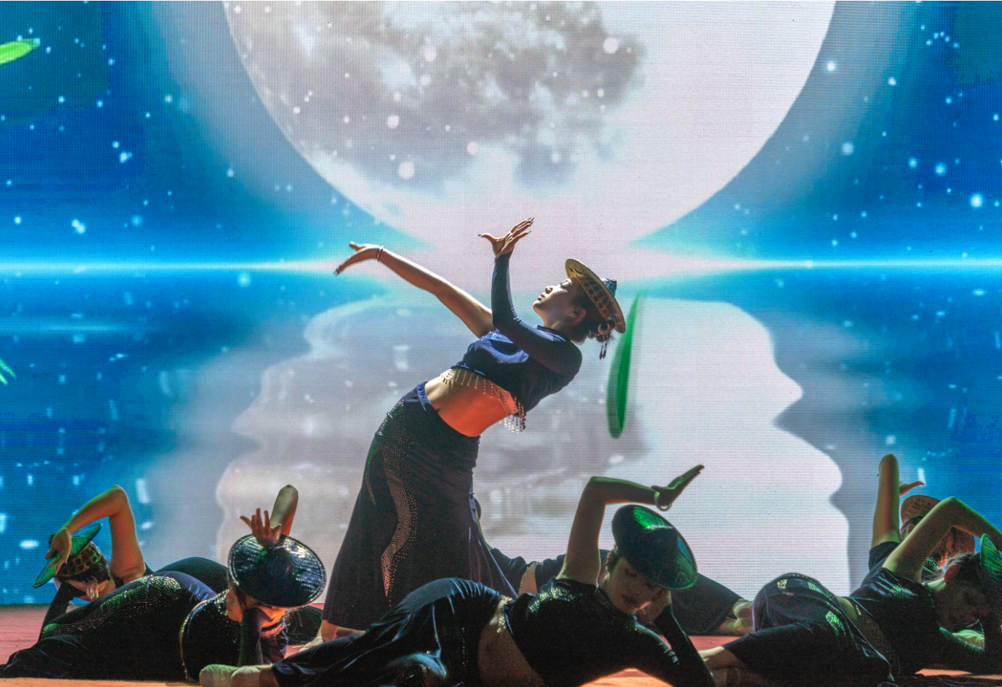 舞蹈《竹林穿梭》将传统傣族音乐与傣族舞、街舞融合,强劲节拍与火辣舞姿引得观众阵阵喝彩。民族舞《生生回响》融合了海南保亭黎族的非遗文化“跳娘舞”,穿着黎族服饰的舞者们敲击瓷碗、摊掌跳摆、甩手祈福,随着民族竹木乐的声音扭动腰身。小品《未来,我来》以毕业生视角展开,揭示了AI技术即使能预知未来,也无法获得完美答案这一道理。