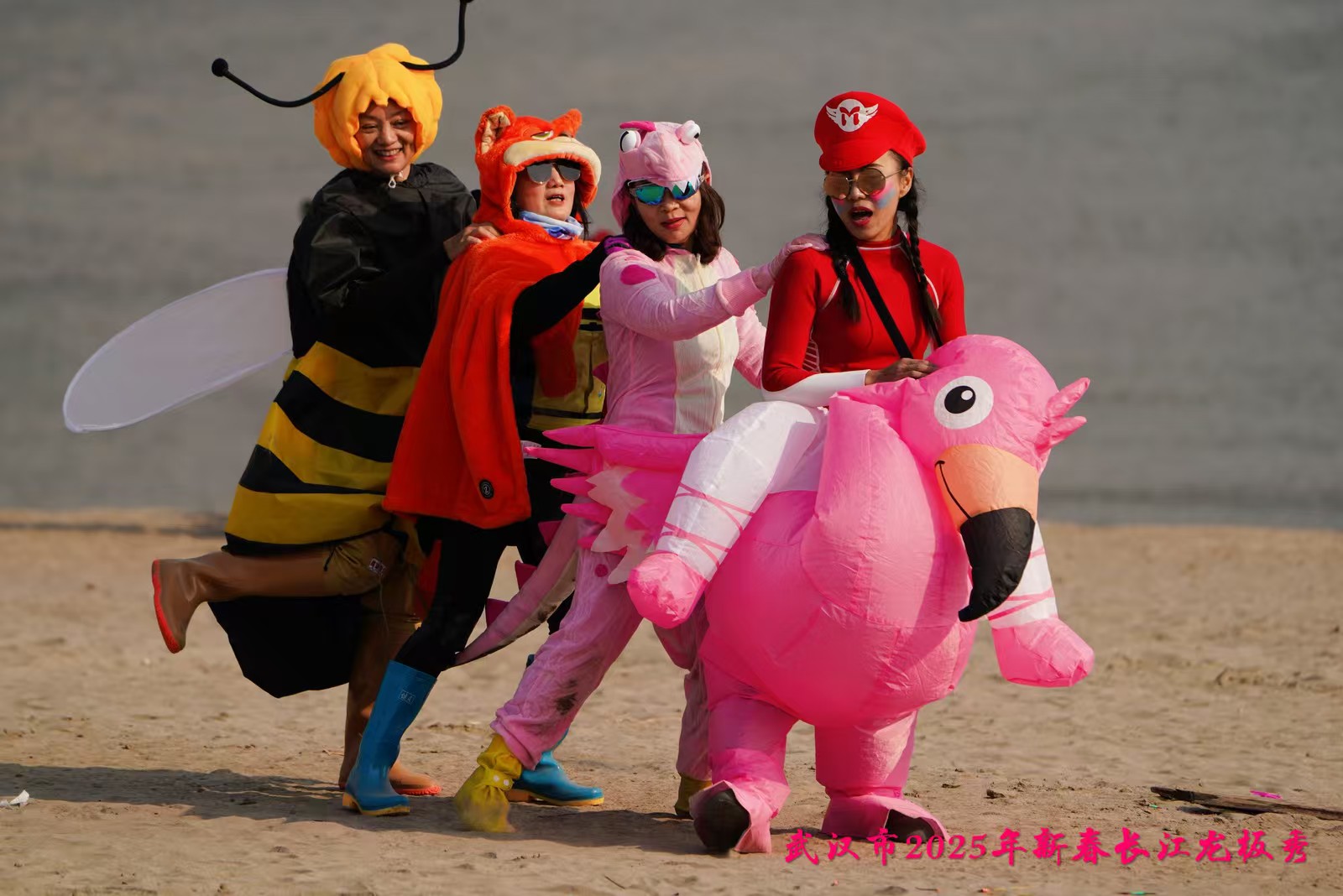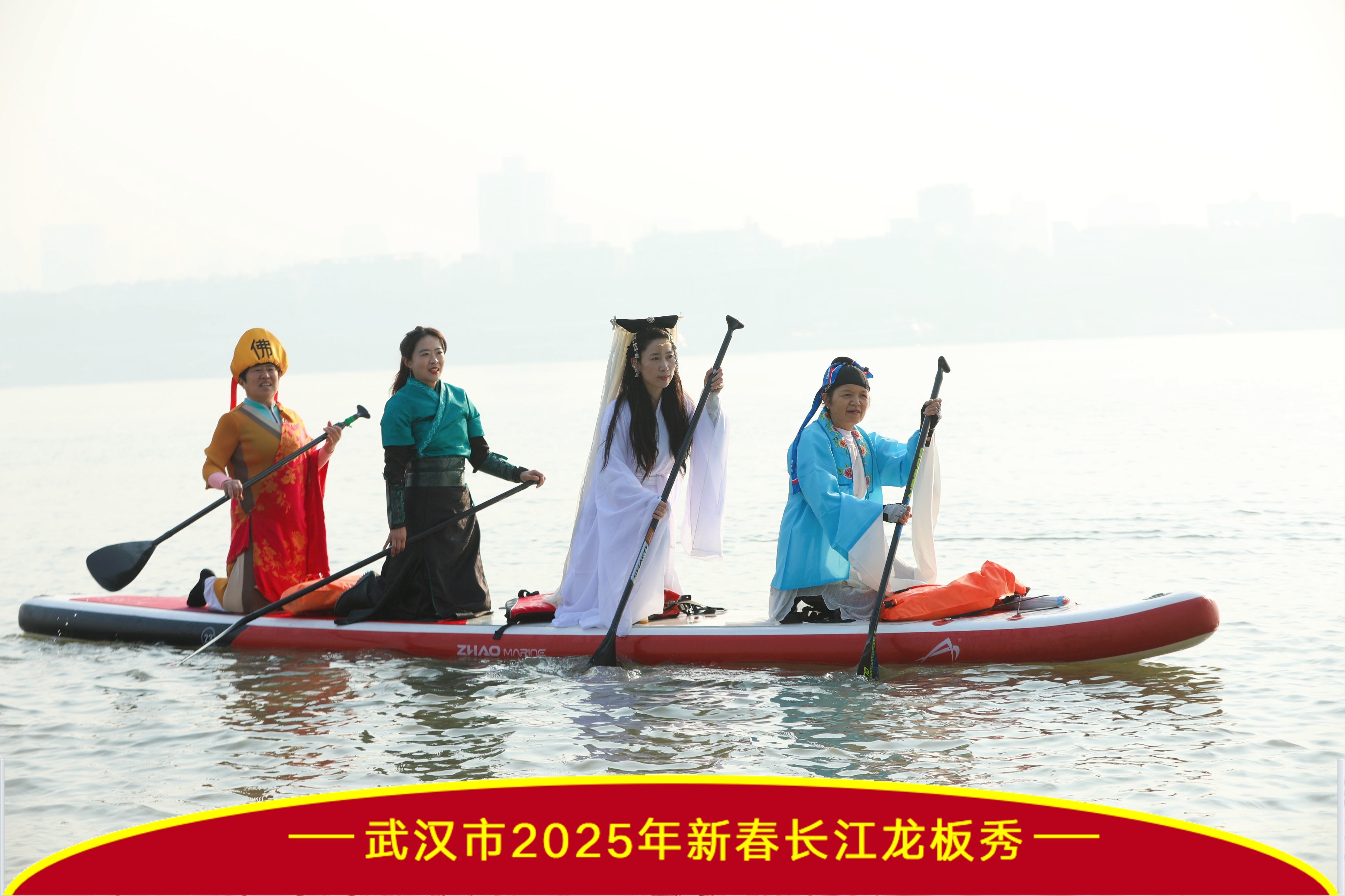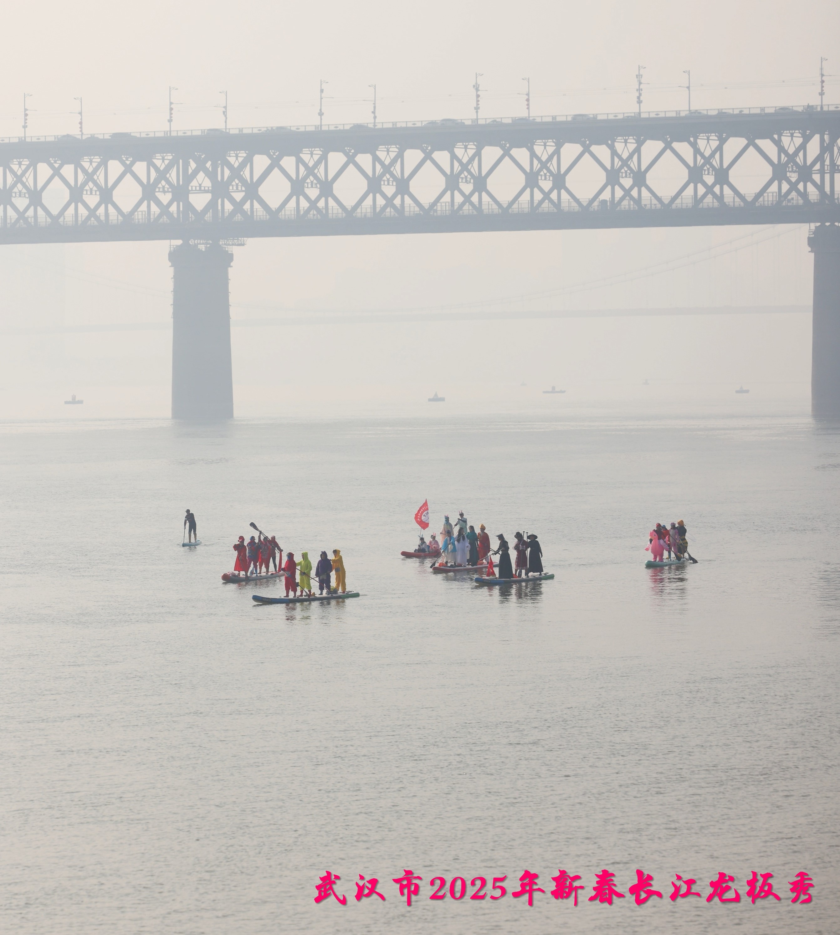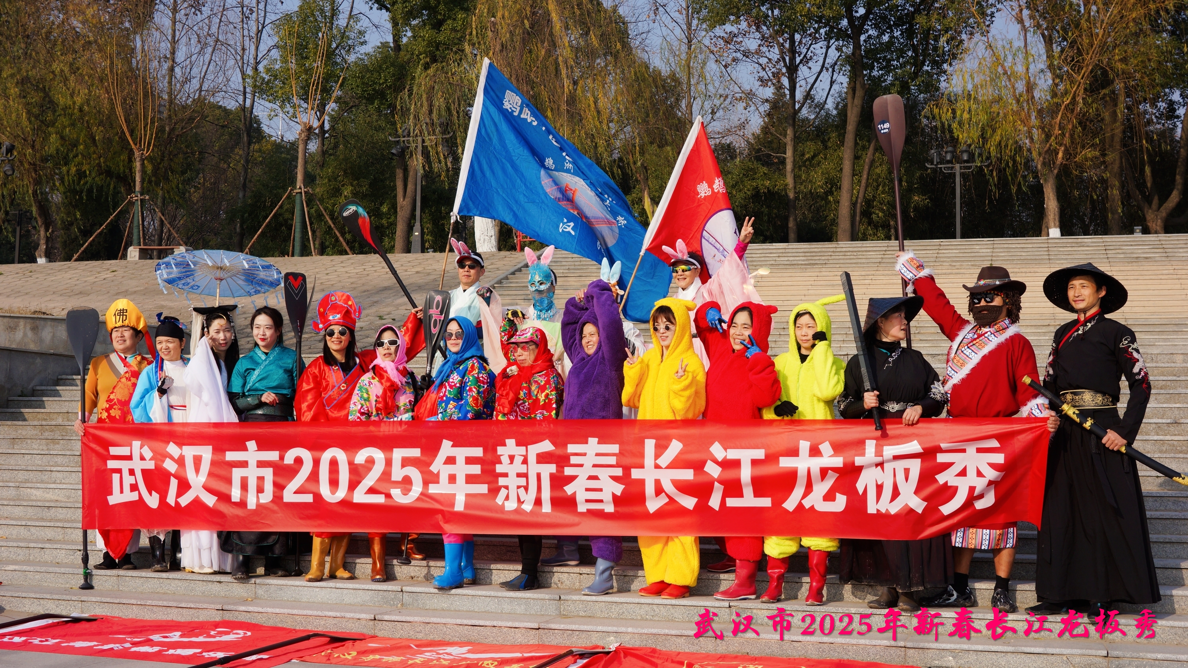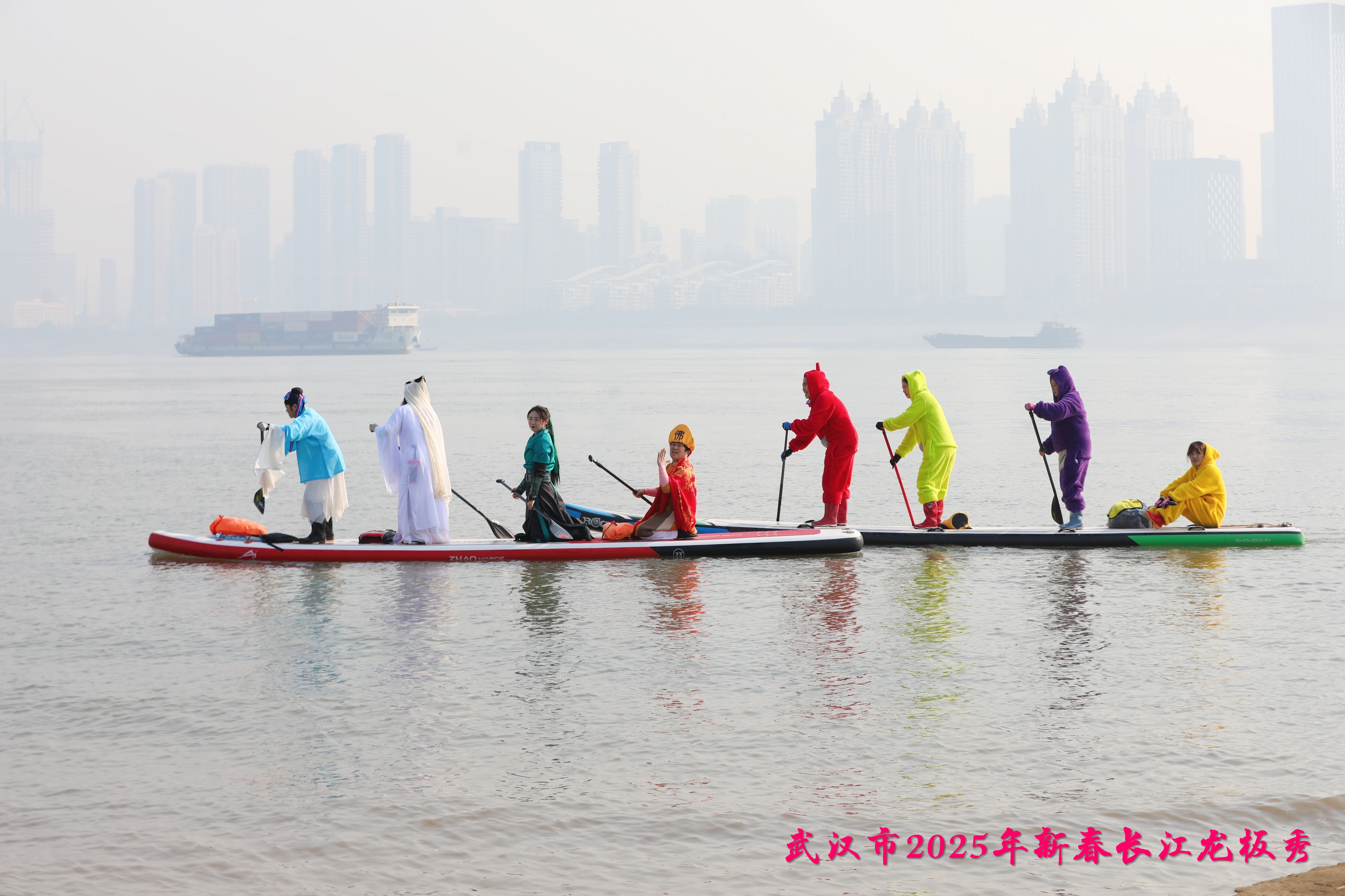 活动现场,来自湖北武汉的平湖门、龙灯、鹦鹉洲、舟旅、汉江湾等6个桨板俱乐部的近30名桨板爱好者参加了此次活动。团队中最小的9岁,最大的有60多岁。职业有中学教师、幼儿园园长、医生、建筑师、银行职员、救生员等。大家身着白蛇传、侠客行、东北大秧歌、汉服等具有鲜明主题的特色服装,从武汉长江一桥出发,经长江划入汉江,途径大禹神话园、晴川阁、南岸嘴、晴川桥等武汉特色网红打卡景点,划程共计2025米。最后,团队成员在南岸嘴用集体歌舞表演的形式共同庆祝2025年新春,也为冬日的武汉增添了一抹靓丽的色彩。