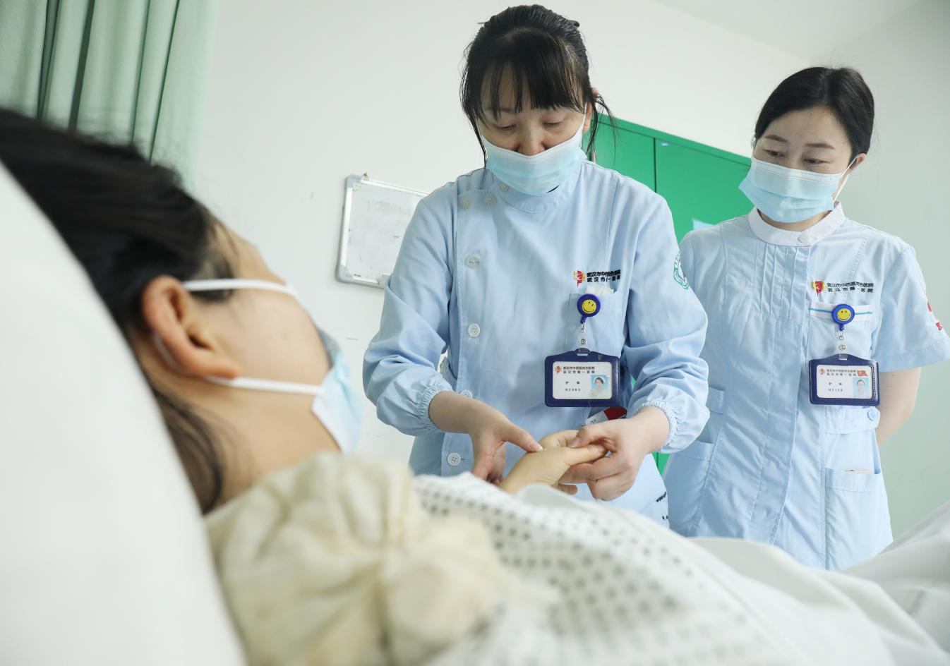 (武汉市第一医院肝胆外科病房内,护理团队为术后患者进行中医适宜技术治疗 通讯员代雨朦胧 摄)