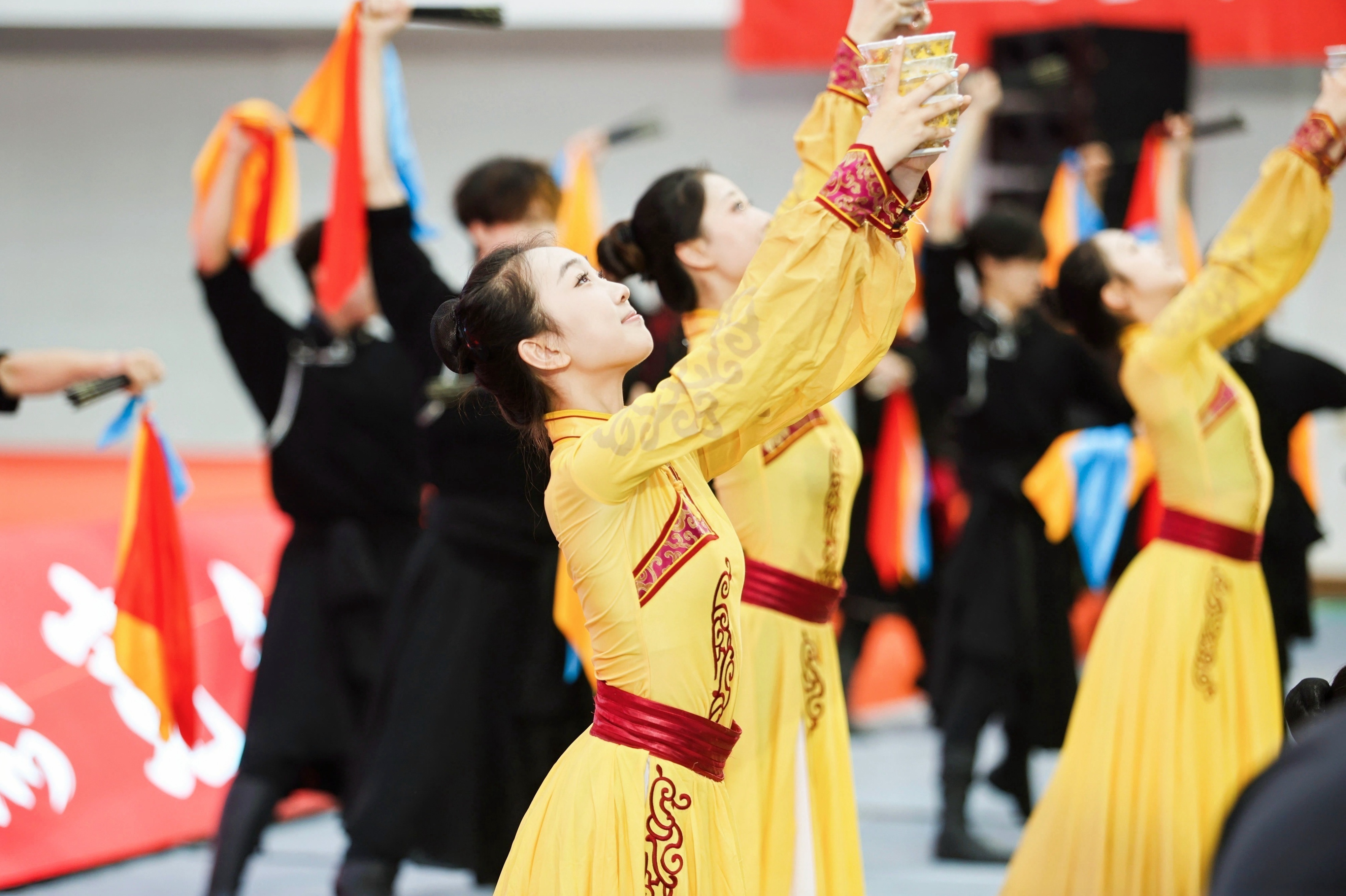毕业典礼启幕前,一场洋溢青春活力的快闪表演燃动全场。社区辅导员手捧向日葵,深情合唱《世界赠予我的》,将“前路坦荡”的美好祝愿化作歌声流淌;现场互动抽奖环节别出心裁,把母校的温情祝福注入原创“双子塔”玩偶,让幸运毕业生将这份牵挂随身携带。音乐舞蹈学院120名学生带来的原创中国民间舞组合《礼赞》,以浪潮奔涌般的蓬勃姿态点燃现场氛围;毕业主题快闪《我爱你中国》旋律激昂,歌声铿锵,谱写出热血飞扬的青春乐章。在毕业主题视频《鲜花》的光影流转中,毕业生们互正衣冠。随后,毕业典礼在全体师生齐唱国歌中拉开帷幕。