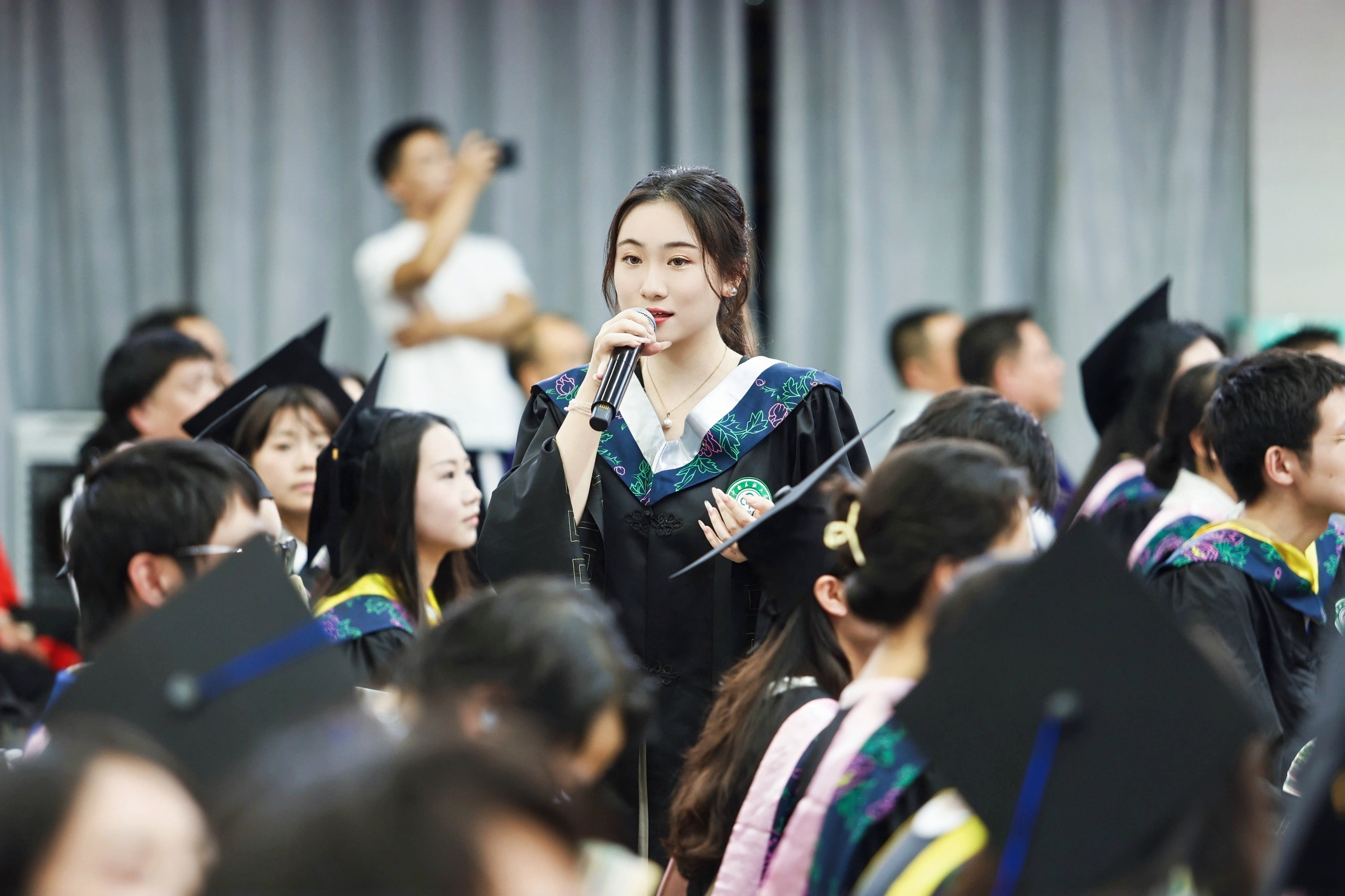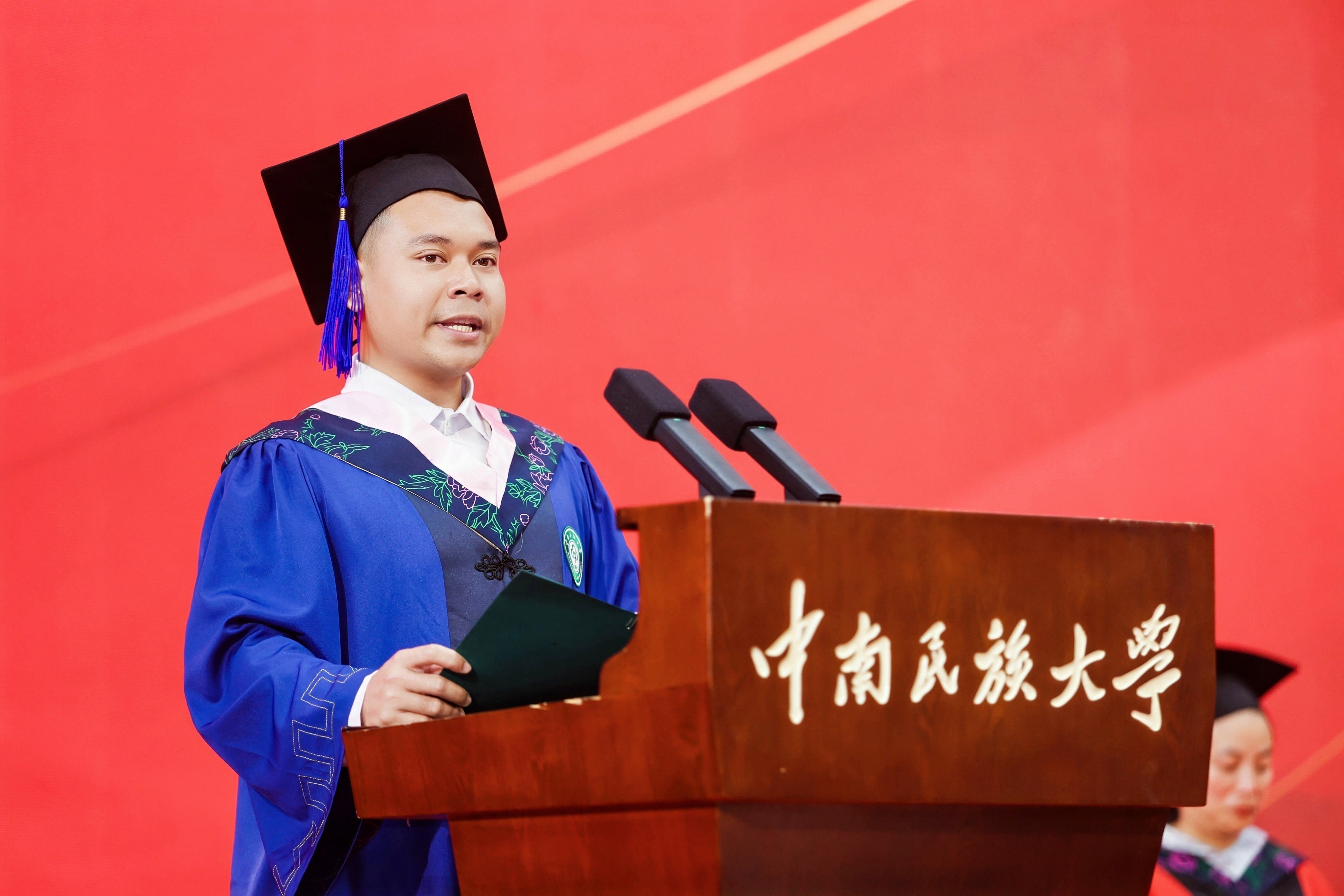 学校领导为毕业生代表行拨穗礼,颁发学位证书。本科毕业生雷晶激动地说道:“从毕业花墙再到印着我名字的学校文创、校友卡,从食堂毕业餐再到毕业歌会,在中南民大四年的求学生涯就如同毕业季一样幸福、充实、难忘,感谢中南民大!”