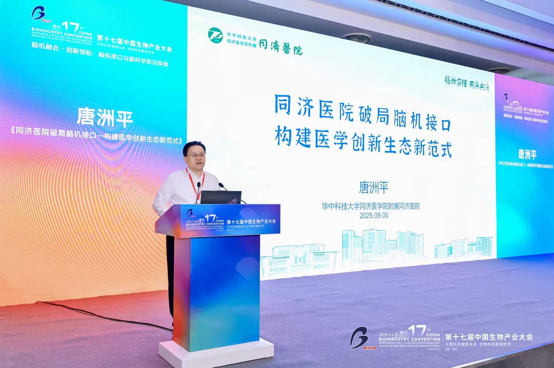 9月5日,在第十七届中国生物产业大会“脑机融合・创新领航:脑机接口与脑科学前沿探索论坛”上,华中科技大学同济医学院附属同济医院党委书记唐洲平作为此分论坛的协办方,向参会的18家脑机接口领域的专家学者、企业代表发起号召,以“产学研医协同创新”携手共进,用科技之光照亮健康中国之路,用中国智慧为人类神经科学发展作出创造性的贡献!