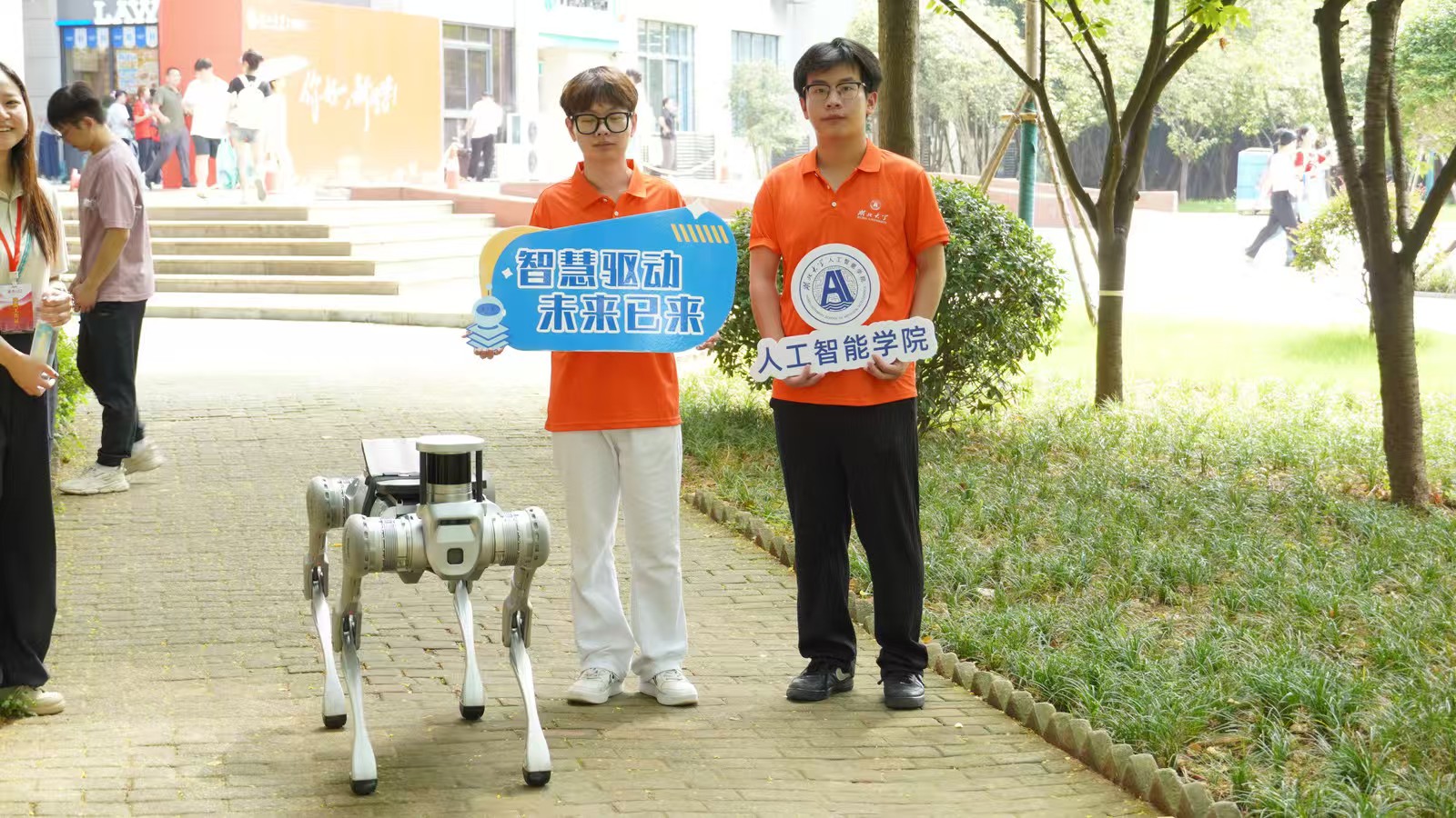 现场共展示有两个人形机器人和四个四足机器人,每个机器人都有独具湖大特色的专属名字。其中,正背着学生行李的四足机器人名叫“湖思睿”。背起沉重的行李,“湖思睿”灵活地穿梭在报到的人群中。遇到行人时,它会停下“思索”,找到穿行的空隙,将行李安全运送到目的地,一路上引发了不少拍照和讨论。没有任务时,“湖思睿”则模拟出狗的神态动作,跑跑跳跳,有时直起身体,收起“前爪”,像是要与人握手。