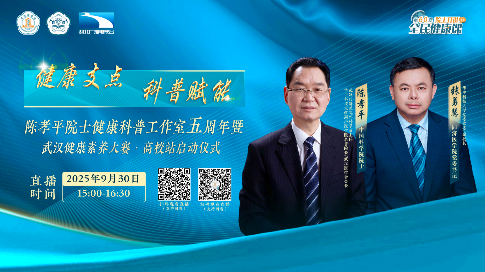 2025年9月30日,陈孝平院士健康科普工作室五周年暨武汉健康素养大赛·高校站启动仪式在华中科技大学同济医学院举行。中国科学院院士、华中科技大学同济医学院名誉院长、武汉医学会会长陈孝平,华中科技大学党委常委、副校长、同济医学院党委书记张勇慧,武汉市卫健委党委书记、主任郑云,武汉市科协党组书记、副主席李定君出席活动。当天,正式启动面向青年群体的健康素养提升行动,为推进“健康中国”战略注入新动能。