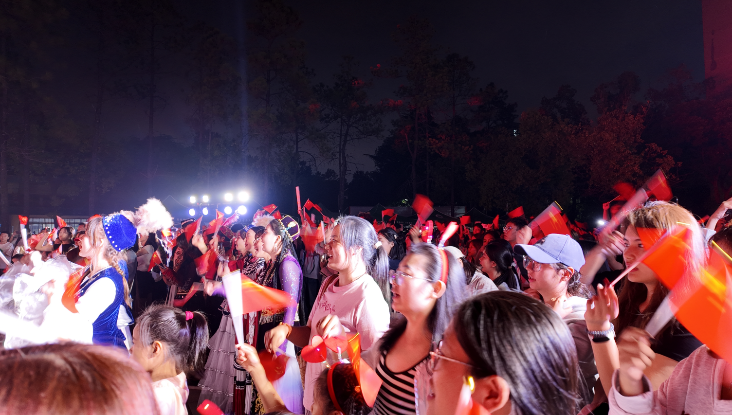 活动尾声,全场的观众朋友们共同挥舞五星红旗,齐声高唱《我爱你中国》。在温情融融的氛围中,师生们畅谈家乡风味,分享民族风情,共筑一段美好且难忘的回忆。