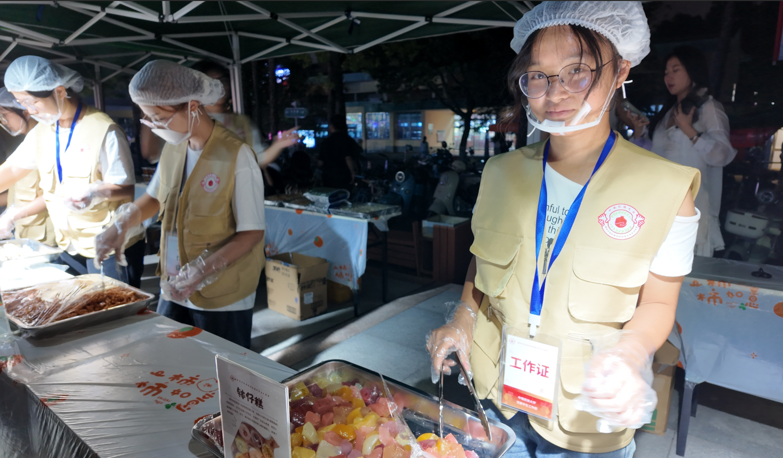 夜幕降临,广场上愈发热闹起来。路灯照亮了这一方暖暖的甜美之地。走近一瞧,有如白玉一般裹了蜜似的糖油粑粑;晶莹剔透、五颜六色的钵仔糕;酱香浓郁、粒粒分明的碎肉抓饭;精心点缀着嫩黄桂花的桂花糕……再配上酸爽解腻的酸角汁、清爽回甘的崂山白花蛇草水,现场的观众们直呼过瘾,赞叹连连!据介绍,活动现场还可通过投壶、华容道等小游戏赢取“粮票”,同学们踊跃参与,气氛热烈。