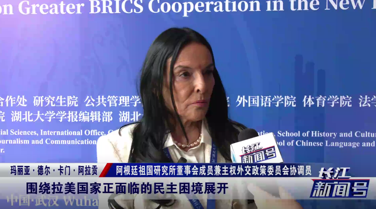 主旨演讲环节,多位中外专家学者围绕透视百年变局,共推“开放金砖”、推动经贸合作,共铸“共赢金砖”、践行多边主义,共绘“公正金砖”等议题进行了深入交流、碰撞思想。阿根廷祖国研究所董事会成员兼主权外交政策委员会协调员玛丽亚·德尔·卡门·阿拉贡曾多次远赴中国考察学习,此次接受《长江新闻号》记者采访时指出,国际局势日益紧张的背景下,部分国家的发展面临着严峻考验,但金砖合作跨越山海,在不同地区和文明间架起和平、友谊和共同发展的桥梁。“很感谢接受到邀请参加此次论坛。我的发言是围绕拉美国家正面临的民主困境展开。如今金砖国家占据了约世界40%的人口,阿根廷应该支持这样的多边合作,而非特朗普所主张的单边主义。因此我很感谢中国所提出的全球治理方案,给其他国家提供了共同发展的契机。”她说道。
