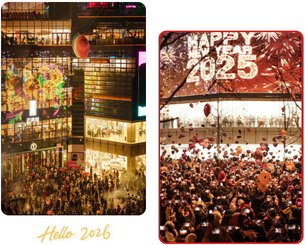 东坡故里黄冈的跨年自带文化底蕴,却不乏现代潮酷感。奥康商业步行街、黄州万达广场联动打造 “购物 + 文化 + 互动” 三维场景,跨年夜的 AI 机器人街舞 battle 秀科技感拉满,数百架无人机在夜空组成东坡诗词、城市地标光影,零点心愿气球放飞氛围感十足。