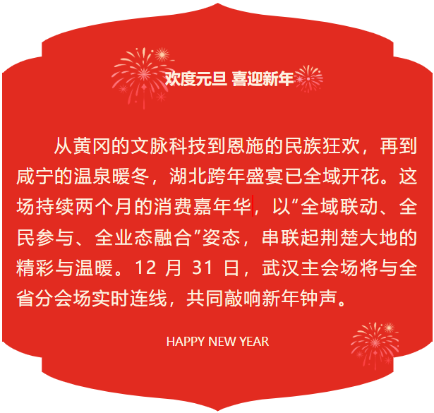 贯穿 2025 年 12 月至 2026 年 2 月的 “支点湖北 乐购全球” 跨年国际消费嘉年华已全域启幕!这场由省商务厅、武汉市人民政府主办的消费盛宴,将于 12 月 31 日 19:30 在武汉龙湖江宸天街主会场盛大启动,《楚歌踏鼓》开场舞点燃氛围,通过大屏连线全省分会场实现“荆楚同频倒数”。