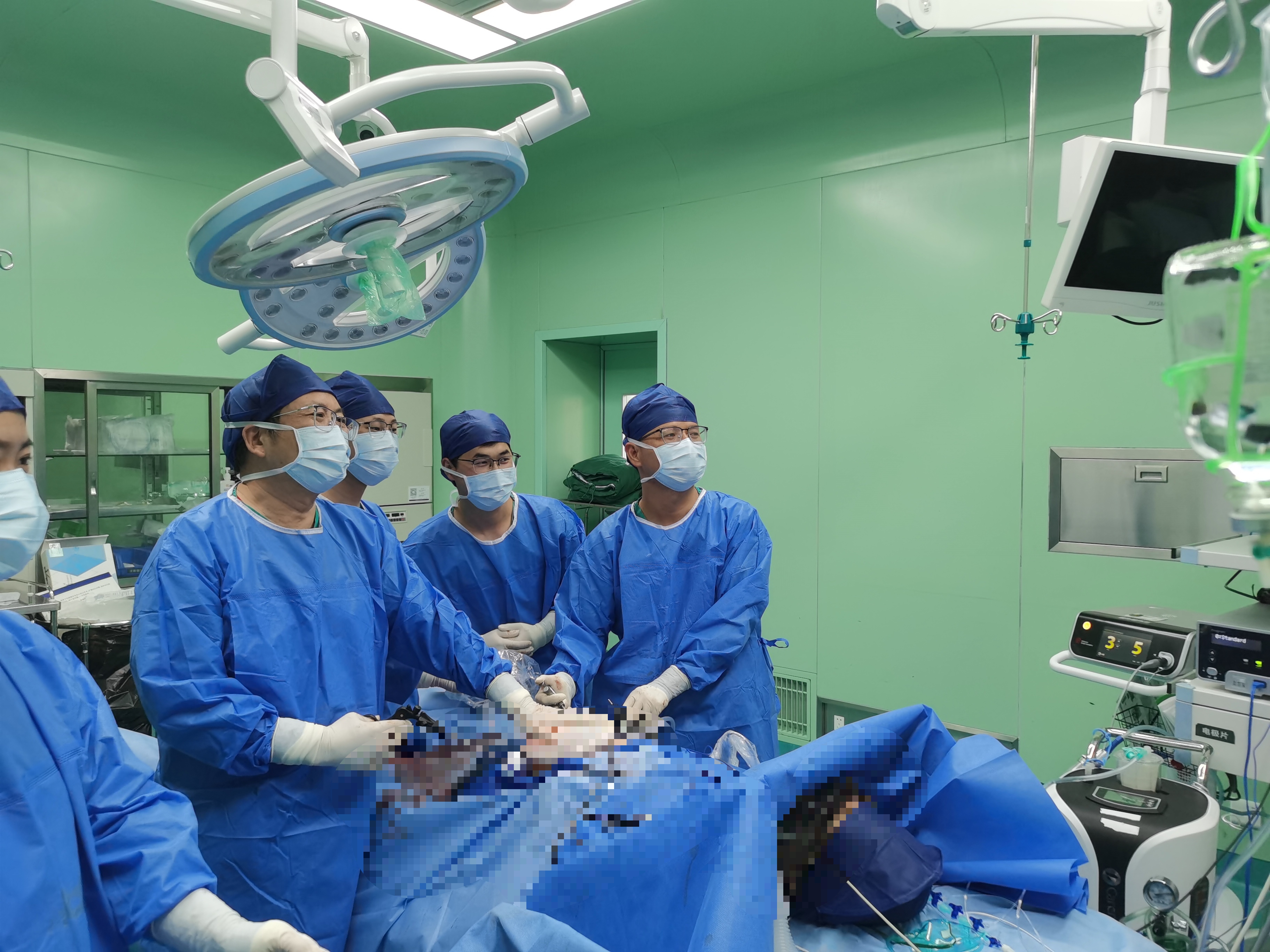 面对这一复杂病例,医院立即启动多学科联合诊疗(MDT)模式,集合胃肠外科、肝胆外科、心血管病科、放射科、麻醉科等多科室专家会诊。通过高清影像学检查,精准勾勒出每颗肿瘤的大小、位置,以及与周围组织的牵连关系。经过反复论证,专家团队确定“同期微创联合切除”方案,在腹腔镜辅助下一次性清除所有病灶。这种方案既能避免分次手术带来的重复创伤,又能通过微创技术减少出血、加速恢复,但对手术团队的配合精度要求极高。手术当日,田军军及彭礼忠副主任医师主刀,带领团队凭借腹腔镜高清视野,先切除盆腔肿物解除压迫,再按规范切除两处结肠肿瘤并完成淋巴清扫,最后精准剥离肝脏转移瘤,全程动作如绣花般精细。