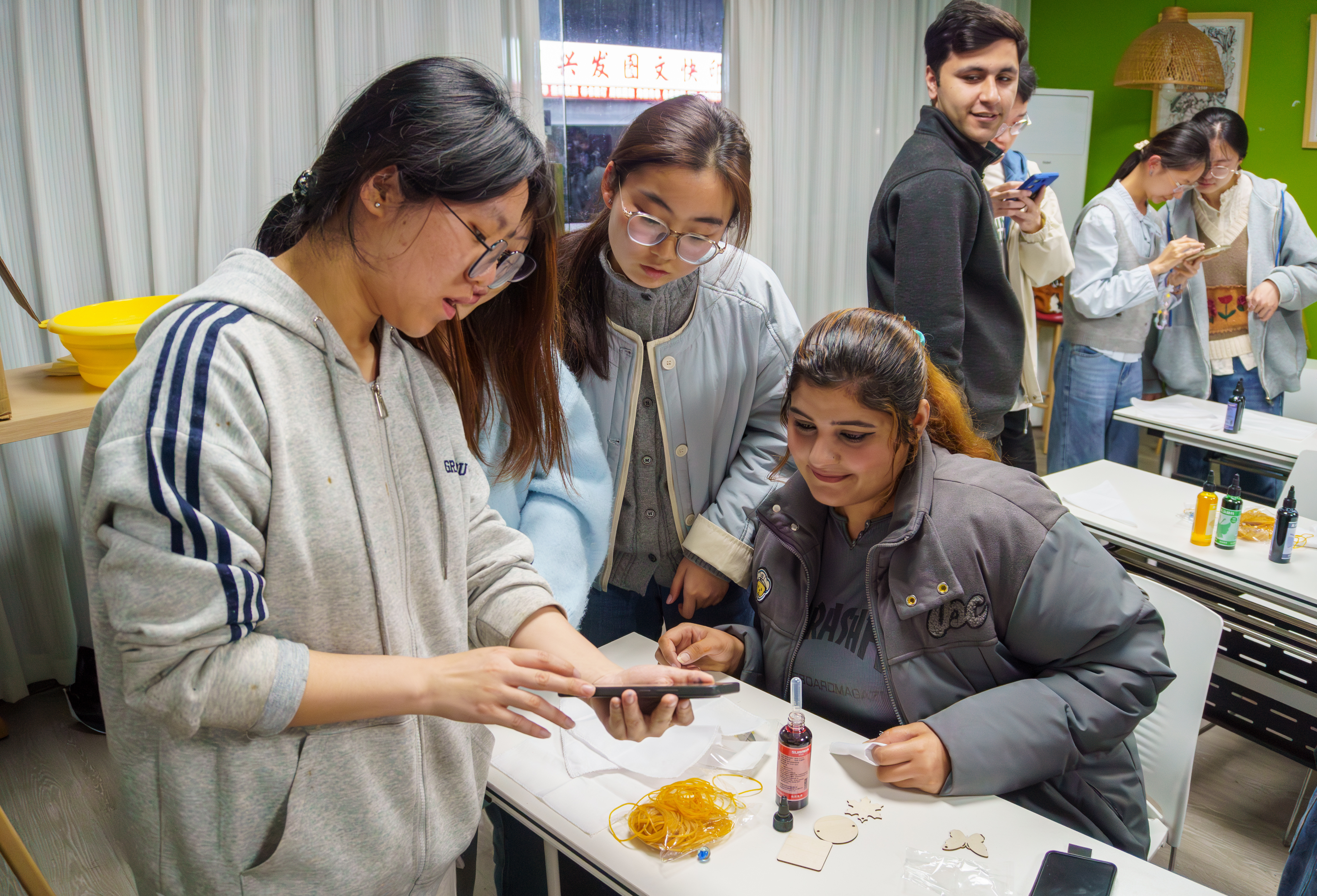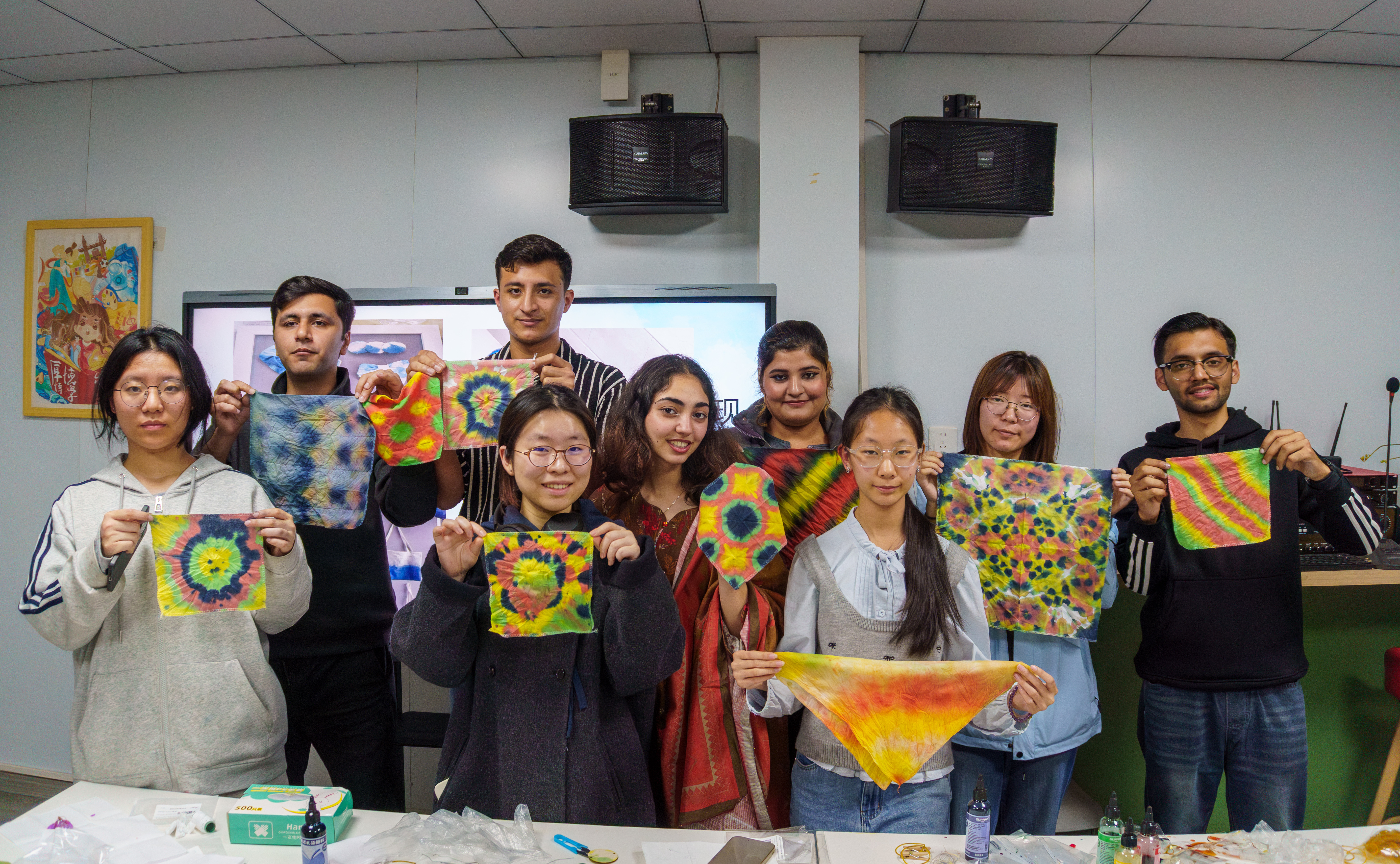 扎染拆线的瞬间,总像开盲盒一样充满惊喜。留学生阿勒烯迫不及待地向镜头展示他的作品——明艳的色彩犹如将彩虹印在了布上。收获满堂喝彩后,他又兴致勃勃地投入到下一次创作中。“扎、缝、夹”,在一次次跨越语言的动手尝试中,中外学生不仅体验了中国传统印染技艺的神奇,更在“一对一”的互赠作品中传递了深厚的友谊。桌面上铺满的不仅是手作的“春天”,更是多元文化交融的缩影。