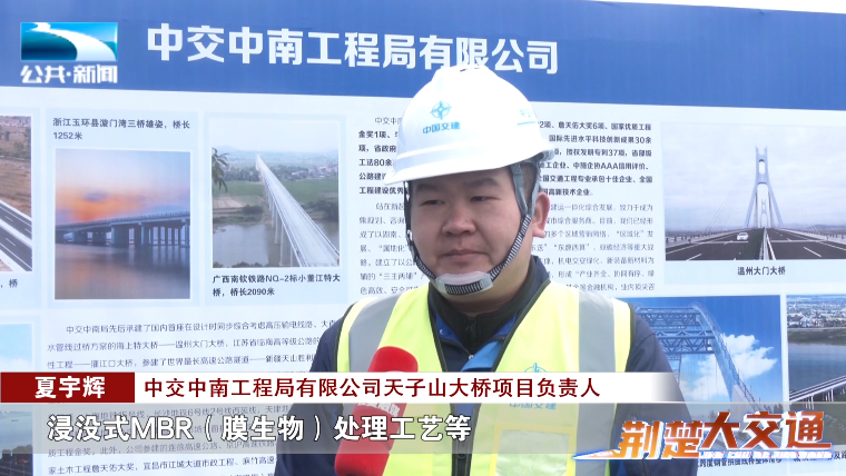 中交中南工程局有限公司天子山大桥项目负责人 夏宇辉:“运用桥梁桩基泥浆干化技术、生产生活污水浸没式MBR(膜生物)处理工艺等,保障梁子湖生态环境。”