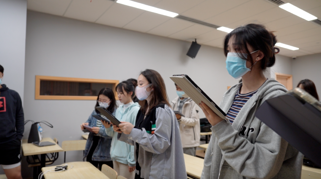 疫情期间无法进棚录制,学生们群策群力在校园里找到了一间临时的“录音室”。虽然条件无法与专业录音棚相比,但社团成员也为保证质量提前设计了录音的方案,提前预判好录音时可能会忽视的细节问题。录音之前,团队通过合作,运用巧妙设计安排,在不影响音乐质量的前提下,保证音乐情绪的完整呈现,也为后期制作的同学争取到更高的效率。社团指导老师高木梓说,社团里有音乐工程系的同学,他们熟悉混音、修音等后期制作技术,而且对于社团内的成员、作品演唱风格特点都非常熟悉,制作起来迅速且得心应手。歌曲视频的拍摄地点选在零陵路上音书院的一角,这里是上音人疫情期间学习、享受休闲时光的地方,多元背景颜色的选用希望给大家带来柔和静谧的感受。