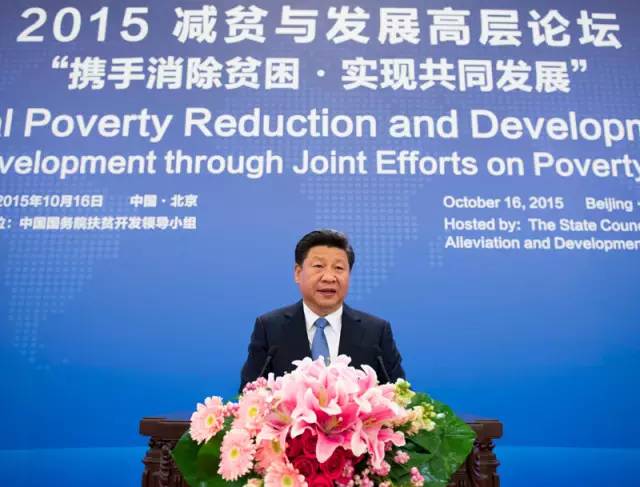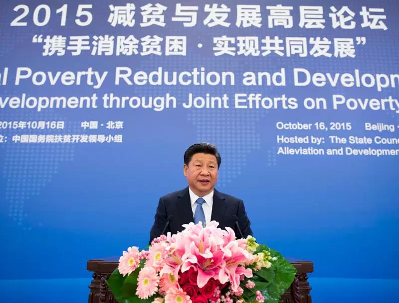 图为:2015年10月16日,2015减贫与发展高层论坛在北京人民大会堂举行。国家主席习近平出席论坛并发表题为《携手消除贫困促进共同发展》的主旨演讲。