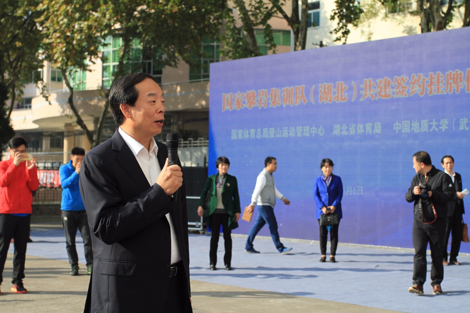 国家攀岩集训队(湖北)共建签约挂牌仪式11月6日在中国地质大学(武汉)举行。国家体育总局副局长赵勇出席,并为国家攀岩集训队(湖北)挂牌。省体育局党组书记、局长胡功民,省体育局党组成员、副局长水兵及局机关相关同志参加仪式。