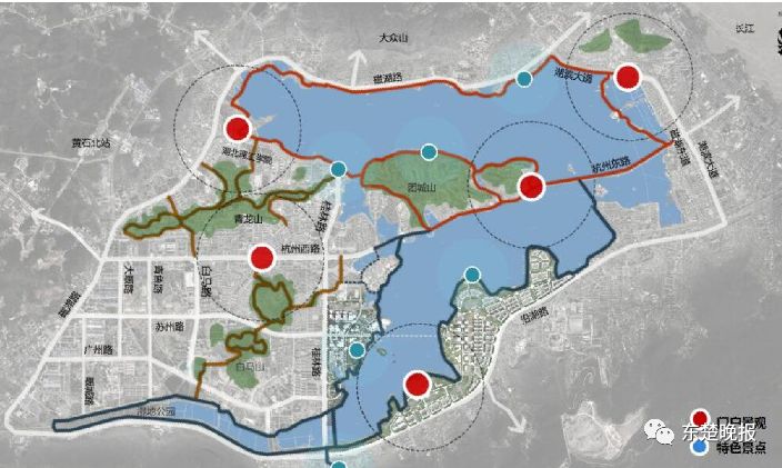 构建湖滨广场、团城山公园大门、柯尔山广场、磁湖南岸文化公园等4大门户景观,具备交通集散、服务配套及门户形象。