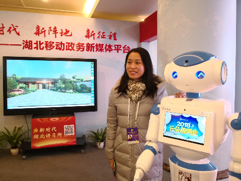 长江云报道 政协湖北省十二届一次会议1月23日在汉开幕,会前,政协委员们来到湖北广电融媒体报道区,和机器人记者云朵互动,参与长江云《嗨,新时代》融媒体直播,观看湖北广电“两会”专题报道。