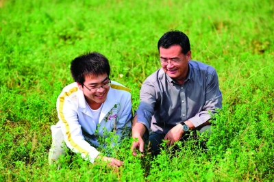 张振华(左)与他的老师在苜蓿试验田间