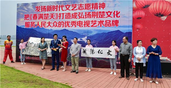 慰问演出现场,省文联党组书记、常务副主席邓长青为第十六届春满楚天全省地方台春节文艺节目展评特别奖——《绿水青山美中华》第八届中国农民春节联欢晚会获奖单位颁奖。省文联秘书长、省文艺志愿者协会常务副主席彭华为阳新县颁发“湖北省影视创作拍摄基地”牌匾。