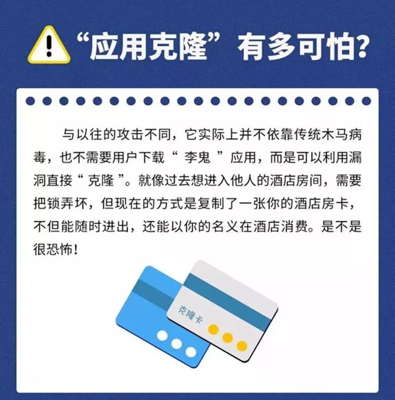 有媒体报道,和过去的攻击手段相比,克隆攻击的隐蔽性更强,更不容易被发现。因为不会多次入侵你的手机,而是直接把你的手机应用里的内容搬出去,在其他地方操作。和过去的攻击手段相比,克隆攻击的隐蔽性更强,更不容易被发现。