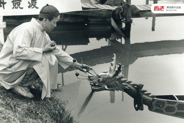 我国欢庆端午节的民俗很多,庆祝方式各式各样,比较普遍的活动有端午食粽、赛龙舟、佩香囊、戴肚兜、悬艾叶菖蒲等等。赛龙舟是靠近水域地区端午节最重要的习俗之一,这一运动先后传入日本、越南及英国等国家,并在 2010 年成为广州亚运会的正式比赛项目。图为 1993 年,香港龙舟锦标赛,新龙舟的点睛仪式。Getty