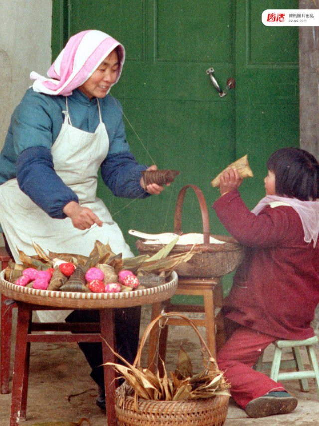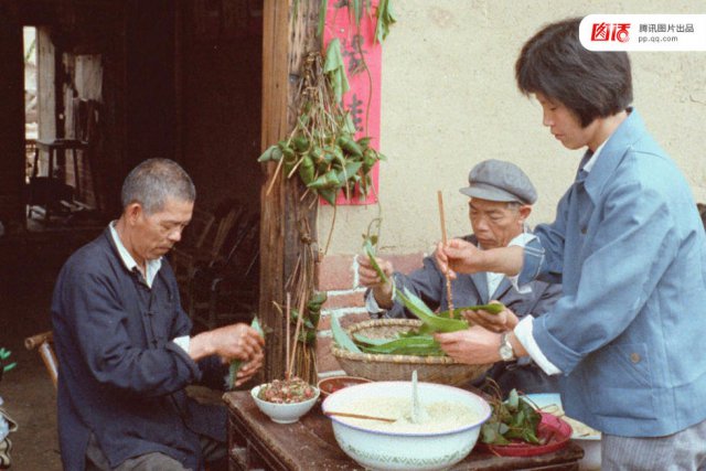 包粽子这一风俗的起源为纪念 2 千年前投江而死的爱国诗人屈原。传说当时人们怕河里的蛟龙伤害屈原,于是投粽子入江以饲蛟龙,以后逐渐发展为在端午节家家户户包粽子,吃粽子。粽子用箬叶或苇叶裹住糯米煮熟,吃起来清香软糯,而和家人一起包粽子的过程更是亲情满溢。图为 1985 年,浙江一位农妇在节前包粽子。新华社记者边伟虎摄