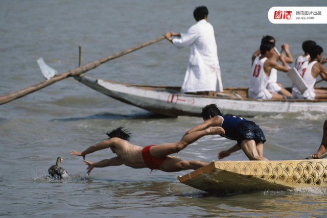 在一些地区,赛龙舟的同时还进行抓鸭子的比赛,龙船快速行进,而船上的游泳高手要跳入江中抢鸭子,场面热烈。据说这是当年民族英雄郑成功操练水兵的方法沿用下来的。图为 1988 年,四川乐山,岷江上的龙舟赛,选手扑向水中捉鸭子。Getty
