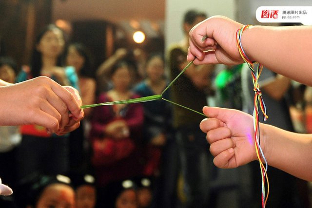 此外,在端午这一天,孩子们要在手腕脚腕上系上五色丝线,并且有说法是遇到下雨时必须将其丢掉,寓意让河水将瘟疫、疾病冲走。图为 2011 年端午节,湖北武汉屈原纪念馆,两名孩子在玩端午 " 斗草 " 游戏,手上系着五彩丝线。新华社发
