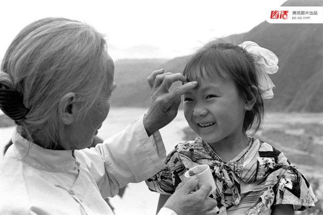 1982 年端午节,这是湖北省秭归县归州公社屈太婆正给她心爱的小孙女红娇点雄黄。雄黄是一种具有去毒作用的矿物。每逢端午节,给小孩额头点上用酒浸过的雄黄,表示可以驱毒避邪、平安幸福。新华社记者于澄建摄