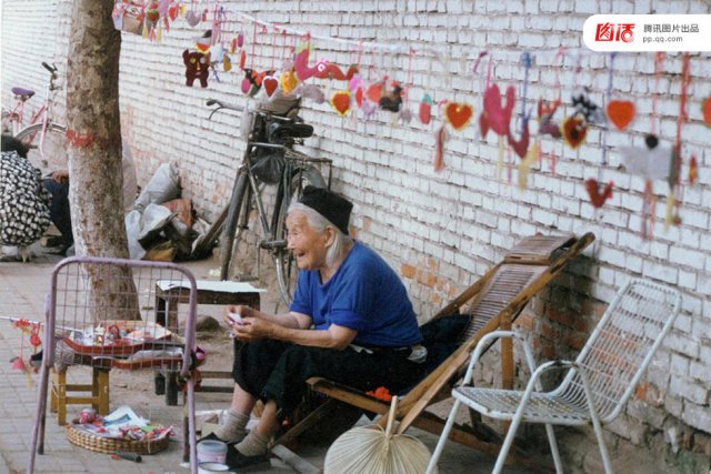 香袋是端午节特有的民间艺品,小孩常戴的是飞禽走兽类的,如虎、豹子,用以避邪驱瘟;老年人则戴戴梅花、菊花、双莲并蒂等图案,为防病健身。图为 1993 年端午节前夕,河南省驻马店市的一位百岁老太太在街边缝 " 香袋 " 送人。周一渤 /FOTOE