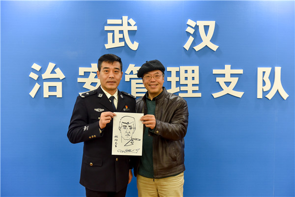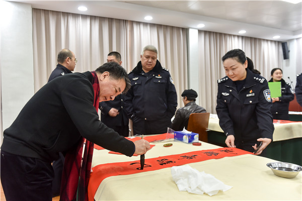 当天上午,省文联荆楚“红色文艺轻骑兵”书画小分队成员,湖北省第二届最美文艺志愿者、省书法院副院长魏启荣,湖北省第二届最美文艺志愿者、省书法家协会副秘书长张尤,湖北省文艺志愿者、省书法家协会理事、省美术院书法篆刻研究所常务副所长张传斌,湖北省文艺志愿者、中国书法家协会会员,省青年书法家协会常务副秘书长袁永安,湖北省文艺志愿者、中国书法家协会会员,书法报社书画天地编辑李河 ,湖北省文艺志愿者、省国画院美术馆馆长倪利华,湖北省文艺志愿者、国画家、漫画家、诗人,中国美术家协会会员、第六届全国美展优秀奖获得者周中华,湖北省文艺志愿者、省国画院专业画家马奕,湖北省第三届优秀文艺志愿者、省国画院专业画家明媚挥毫泼墨,创作书画作品、写春联写福字、画“三十秒”人物速写作品,受到了民警们的 热烈欢迎。