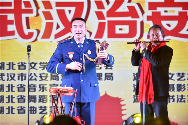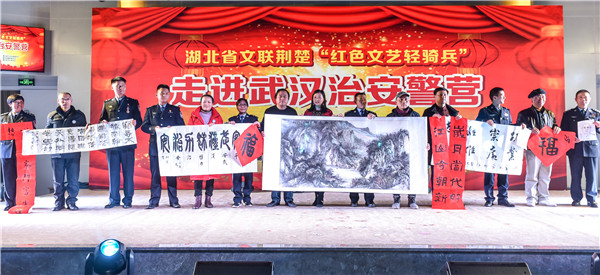 演出现场,湖北省书画家们还将创作的书画作品、春联福字现场赠送给了基层公安干警。