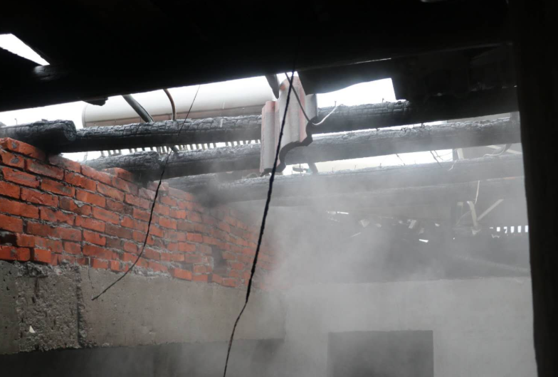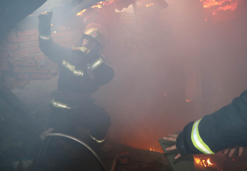 消防员到场后,发现现场浓烟密布,经侦查询问得知该着火民房里面堆积的大量杂物,无人员被困,大火正处于猛烈燃烧阶段,火势已突破外壳。由于房屋为土木结构建筑,使得火势难以控制,且蔓延速度快,对楼下居民造成巨大威胁。指挥员迅速下命,单干线出一支水枪堵截火势向两侧蔓延,同时全力进行扑救,另一支水枪从房顶上对屋内进行击打,经过队员们一个多小时的奋力扑救,大火被彻底扑灭,最后队员用排烟机对屋内进行排烟处理,现场无人员伤亡。