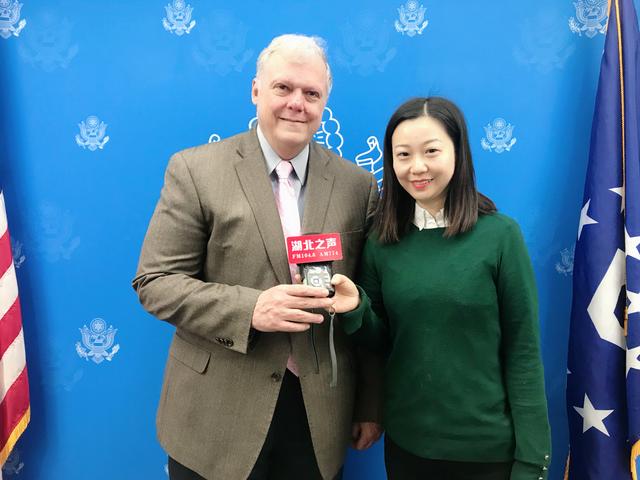 左:美国驻武汉总领事傅杰明 右:湖北之声主持人万敏