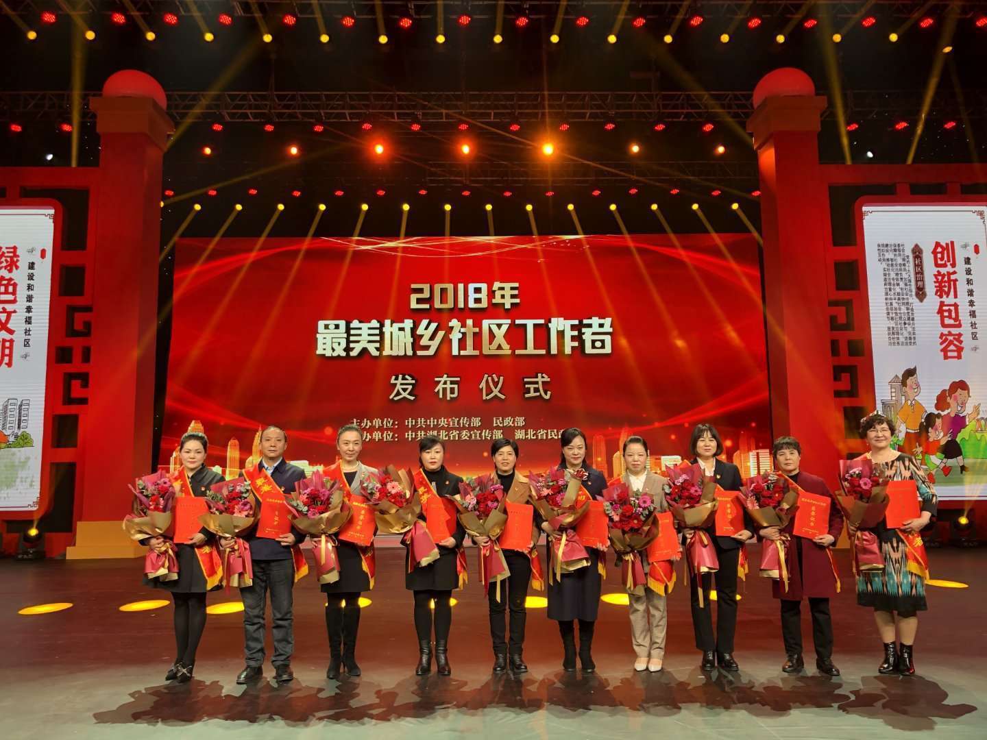2月24日上午,由中共中央宣传部、民政部主办,中共湖北省委宣传部、湖北省民政厅承办的2018年“最美城乡社区工作者”发布仪式在汉举行。发布仪式现场播放了10位“最美城乡社区工作者”先进事迹的视频短片,从不同侧面采访讲述了他们的工作生活感悟。中共中央宣传部副部长梁言顺、民政部副部长詹成付出席发布仪式,并为10位“最美城乡社区工作者”颁发证书。湖北省委常委、宣传部长王艳玲,湖北省民政厅厅长柳望春、副厅长叶景丽出席发布仪式。