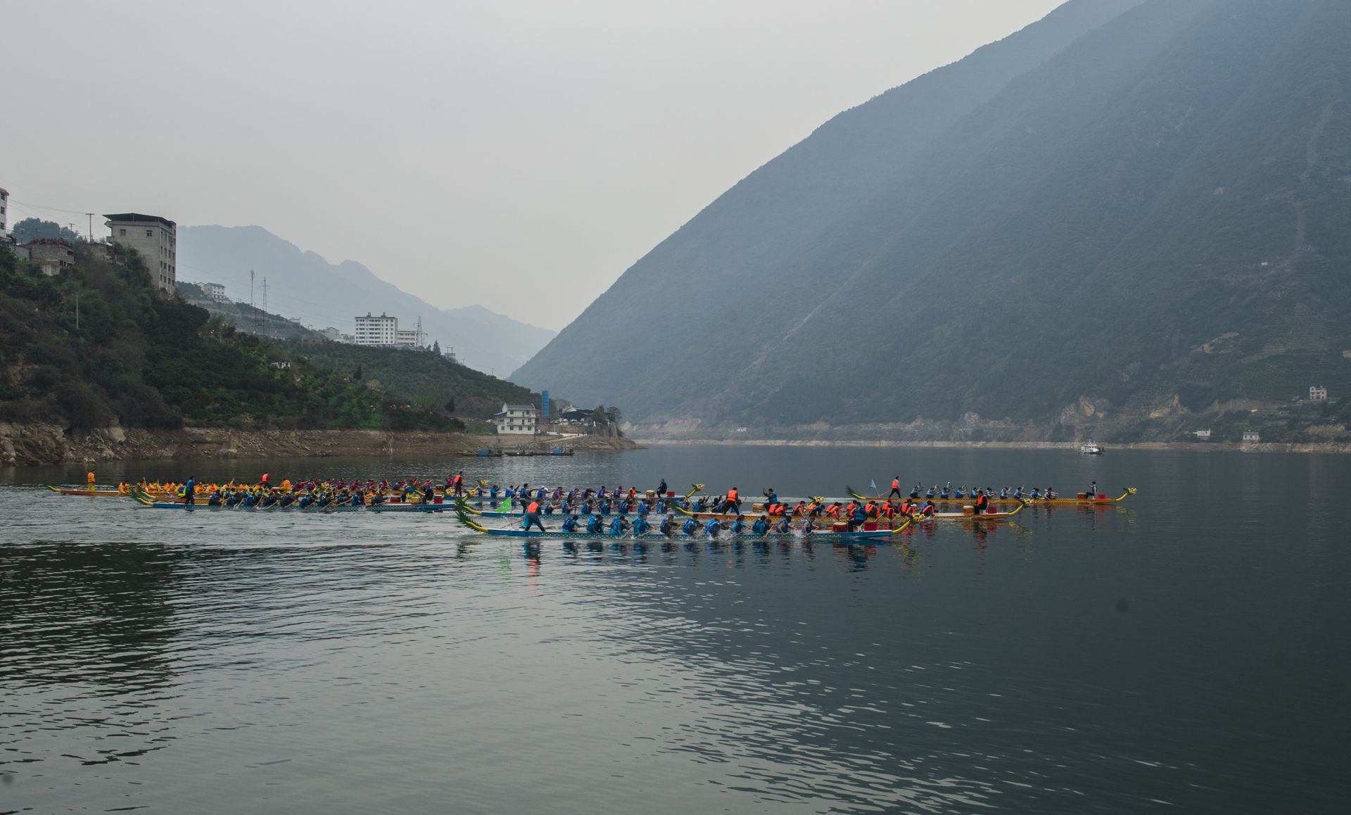 同时,哨声响,鼓点起,9支22人标准龙舟队同时竞发,苍山碧水间红旗猎猎、船桨翻飞、你追我赶、争先恐后,向终点的彩头花结奔去。河岸上游客情绪高涨,随着《龙舟号子》一唱一和,为心仪龙舟加油助威,热情点燃了春寒。龙舟竞渡结束后,龙舟队仿照旧时峡江船商初到一地须“拜码头”的习俗,沿着江边香溪源码头、乔家河码头和万古寺村码头,依次拜访,贺喜村民仓廪充实、游客幸福安康。