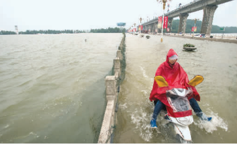 7月2日,汤逊湖湖水已淹至汤逊湖大桥桥面。据介绍,这是大桥自2009年建成以来第一次出现水淹没桥面的情况