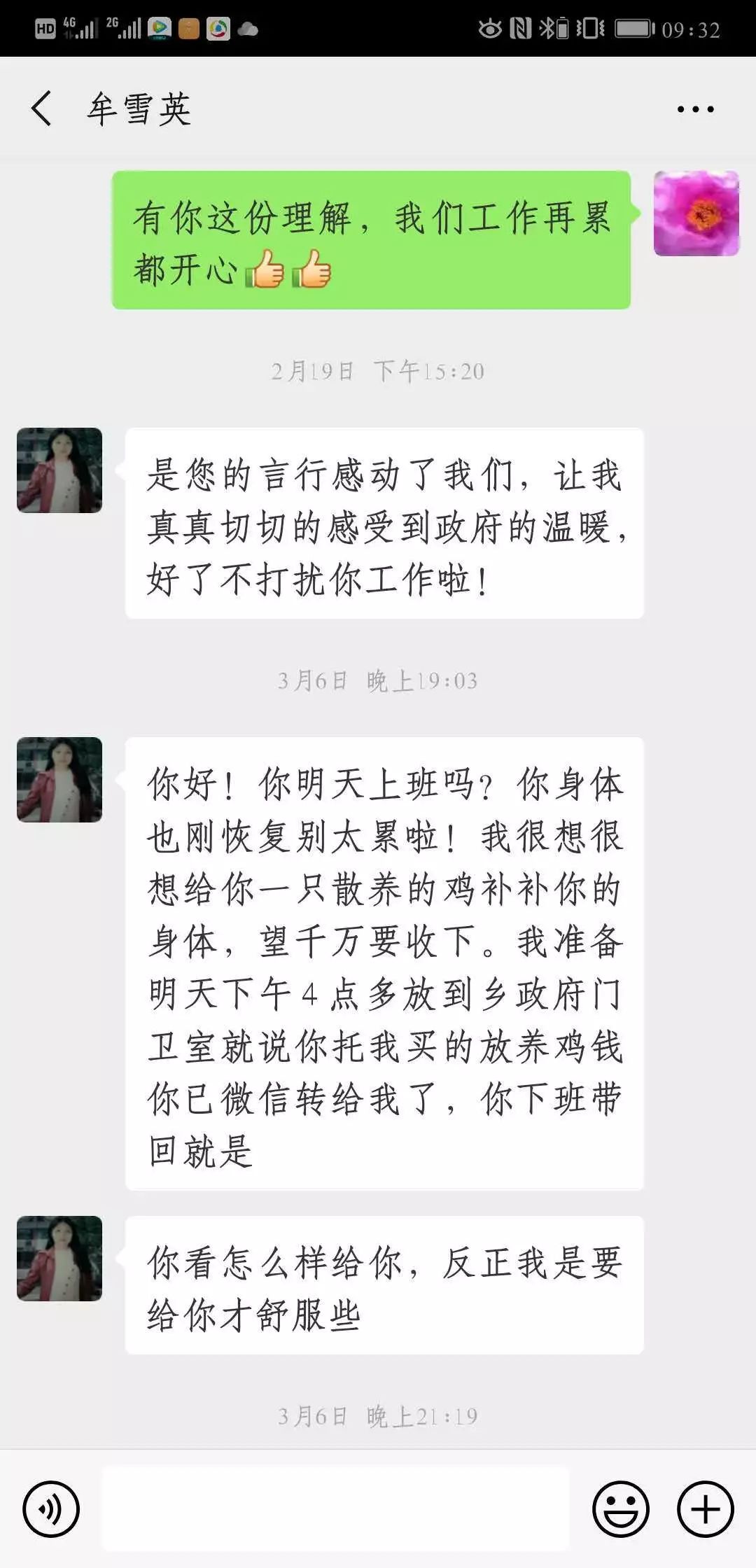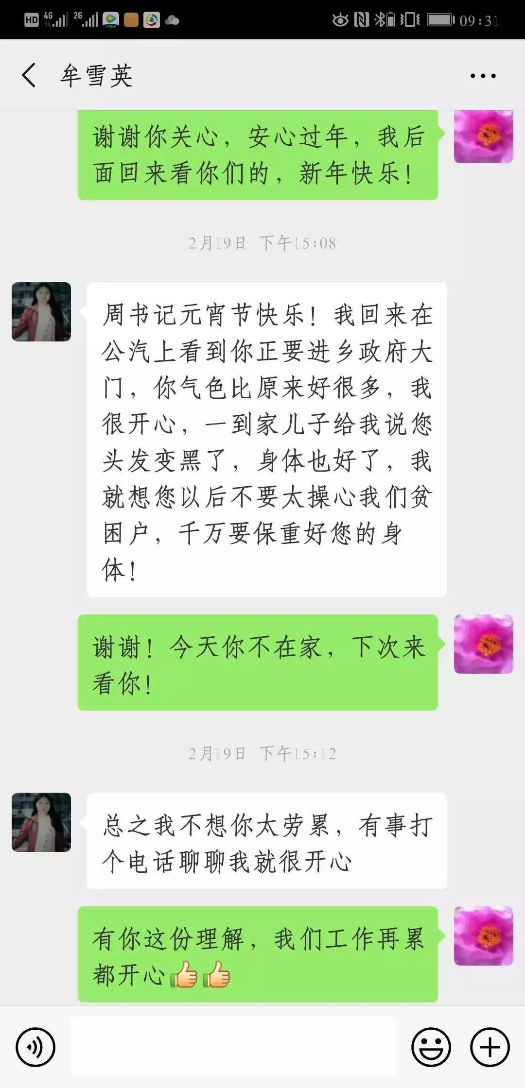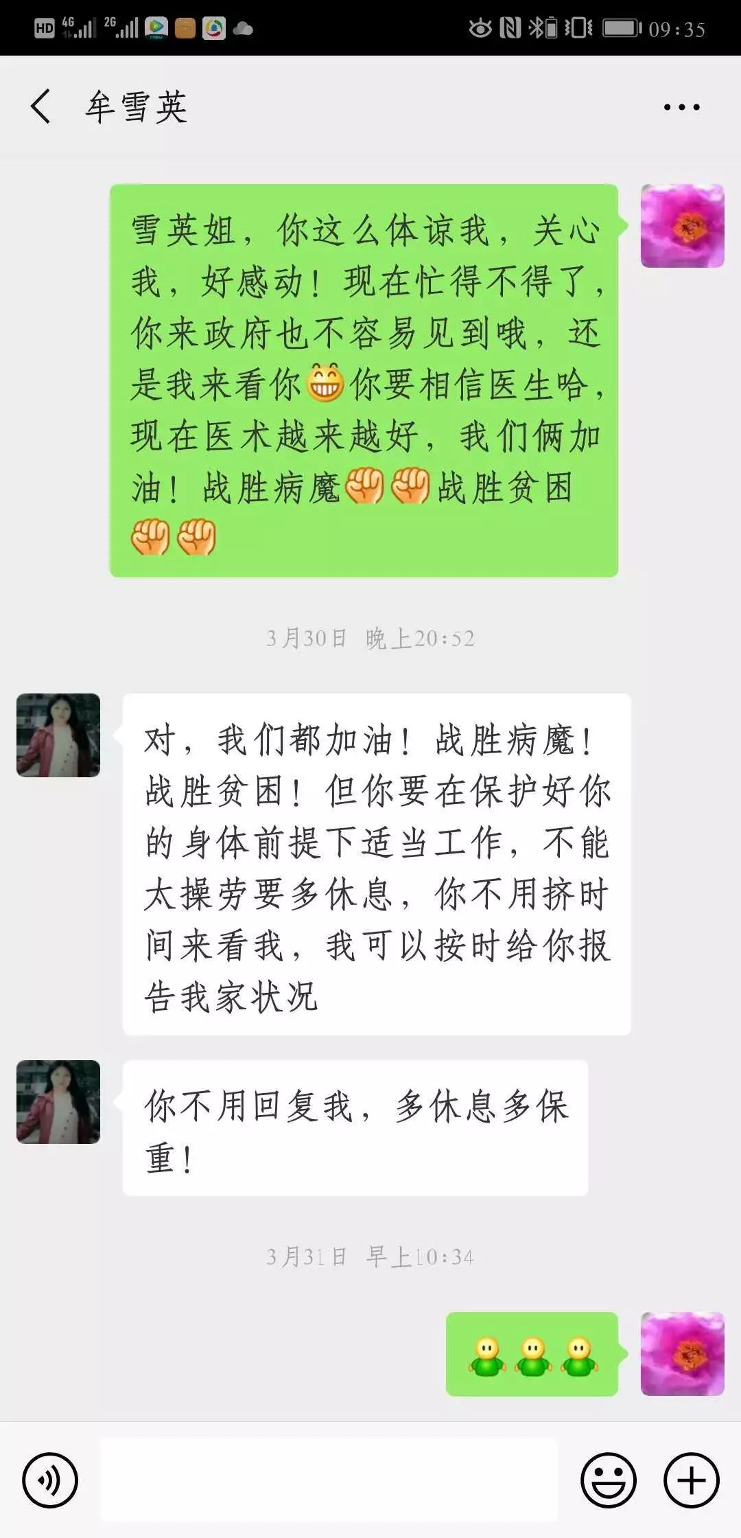 在微信中,牟雪英总是叮嘱周德燕注意身体,责备她为贫困户操碎了心,把自己的身体也累垮了。