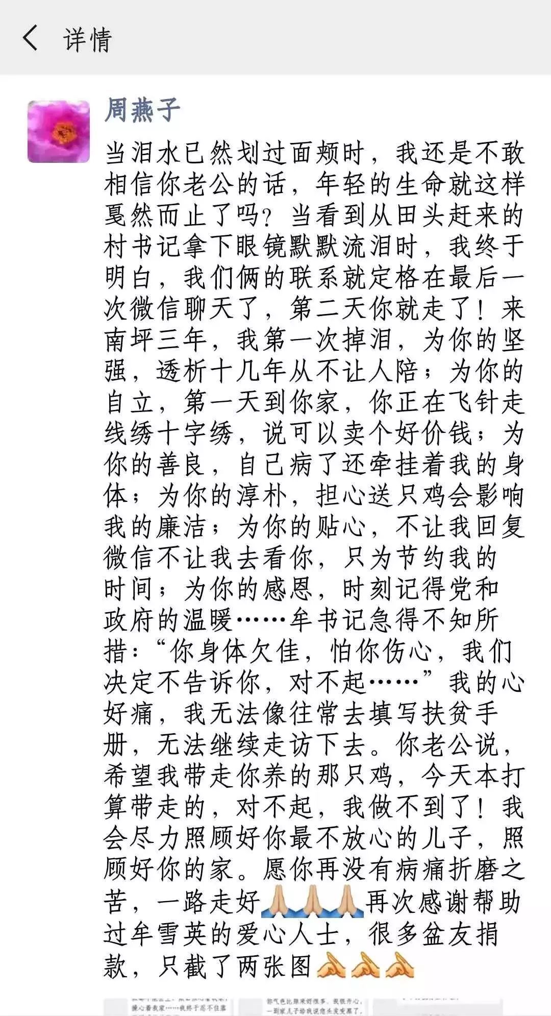 这是湖北省恩施州利川市南坪乡党委书记周德燕在扶贫对象牟雪英病逝后,在朋友圈写下的真情感言。