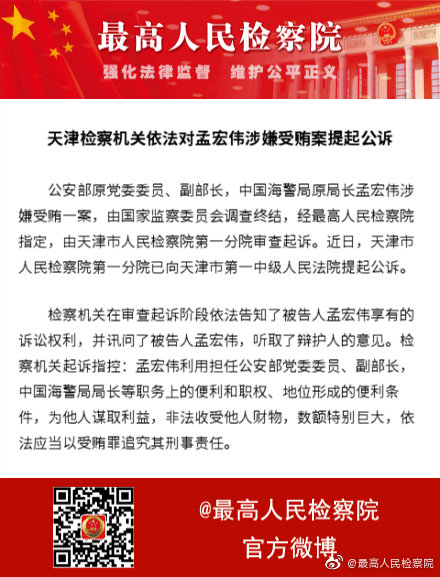公安部原党委委员、副部长,中国海警局原局长孟宏伟涉嫌受贿一案,由国家监察委员会调查终结,经最高人民检察院指定,由天津市人民检察院第一分院审查起诉。近日,天津市人民检察院第一分院已向天津市第一中级人民法院提起公诉。