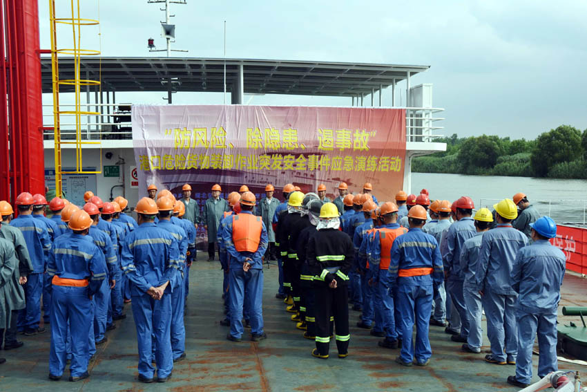 “安全生产是天大的事、天下的事、天天的事,我们要警钟长鸣、居安思危、苦练内功、防患未然。现在港口危化安全应急演练开始。”6月6日下午,随着省交通运输厅副厅长王本举的话音刚落,一场以“防风险、除隐患、遏事故”为主题的港口危险货物装卸作业突发安全事件应急演练,在武汉恒阳化工储运有限公司码头1号趸船开始。