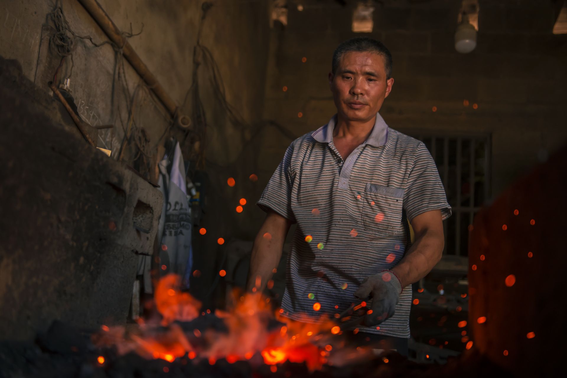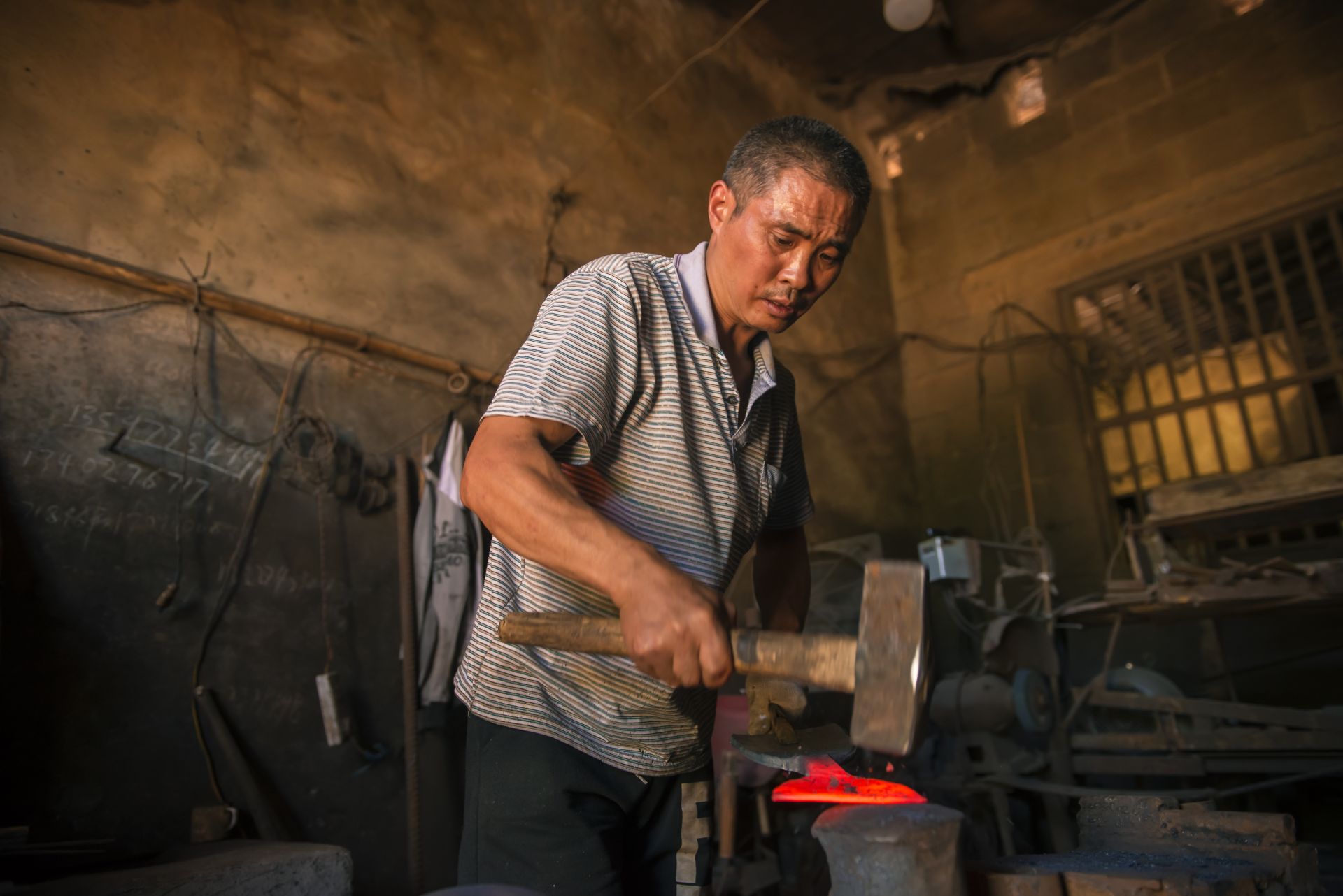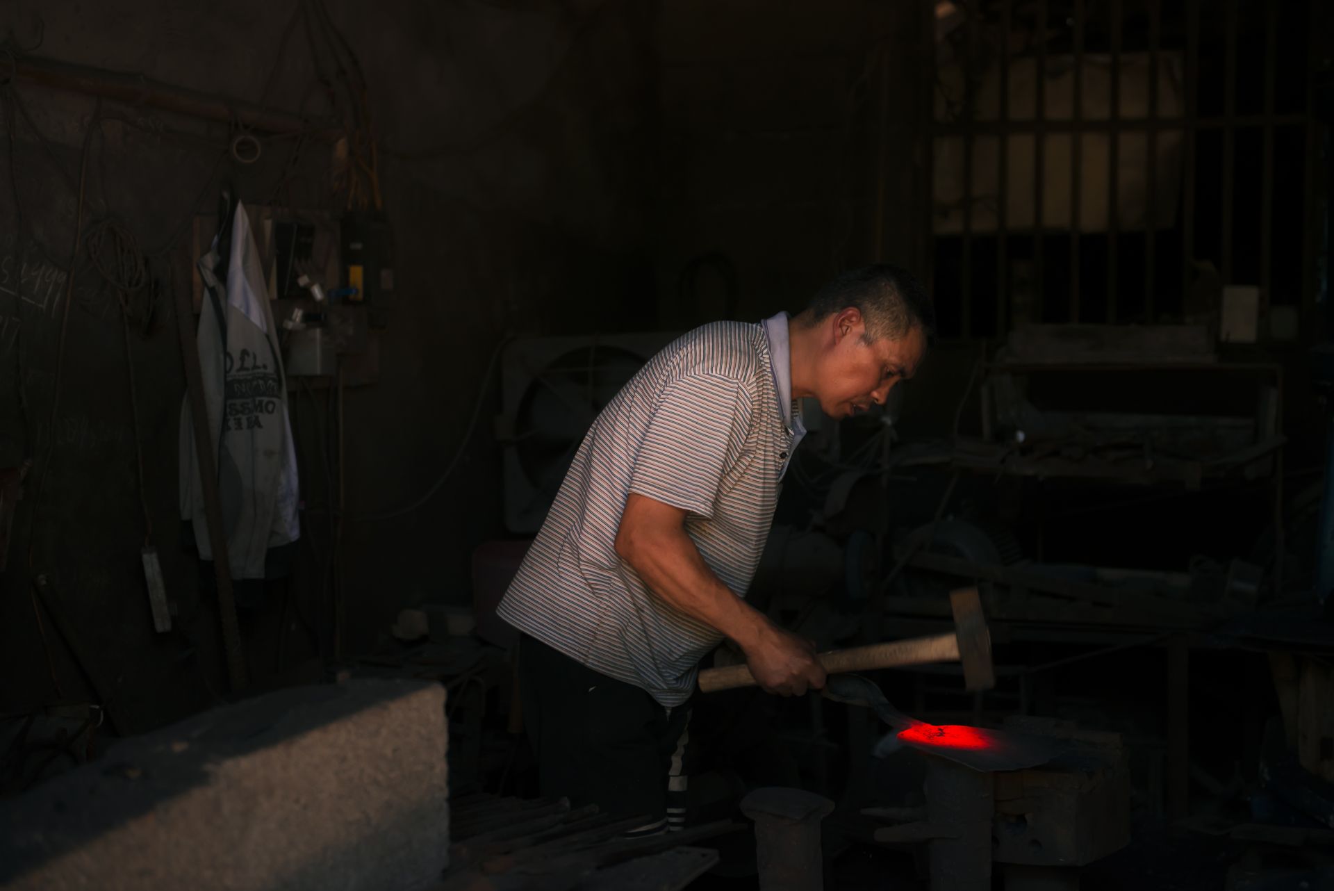 上世纪50年代,国家实行工商业社会主义改造,公私合营。三里成立“三里铁业社”,1953年李宗成率队参加全县打铁比赛,斩获全县第一名,由此,“三里铁业社”名声鹊起。 一把手工打造的菜刀需要经过30多次淬火,不断锤打,把杂质给砸出来,然后一遍一遍打磨。李正兵说,各种铁器,尽管外形好看,如果淬火技术不过关,就是中看不中用。要不就是钢火硬了容易缺口;要不就是钢火软了容易卷口。或者说,铁匠们锤炼的不仅是铁坯,也是对自身的千锤百炼,他们忍受着炉火炙烤、铁屑烫身,锤炼着力与巧、勇与毅。