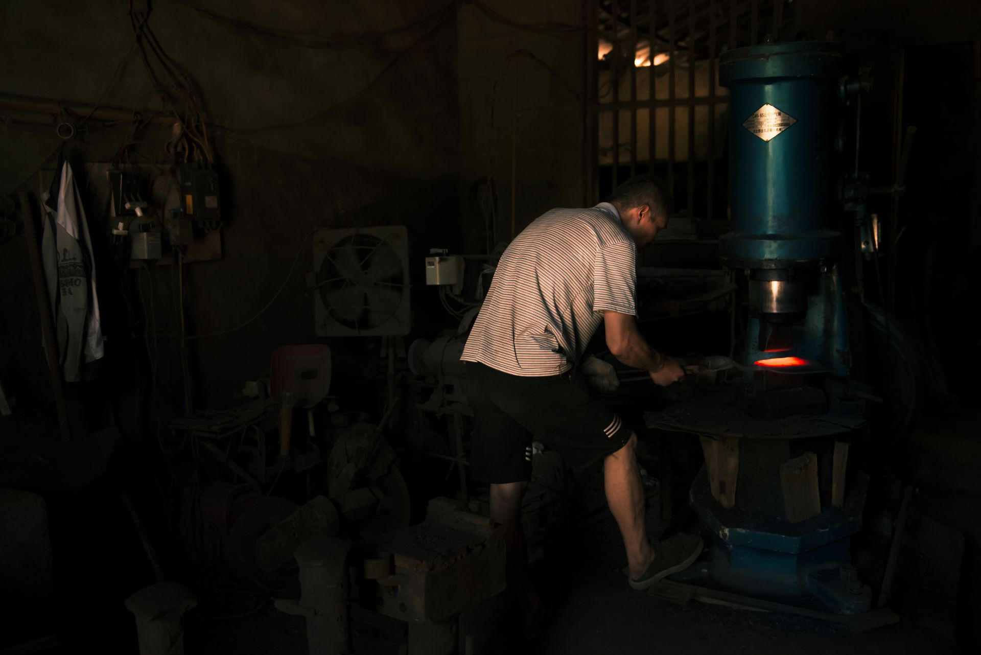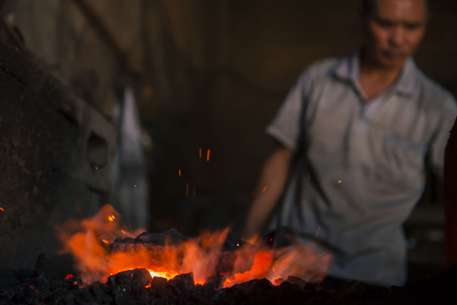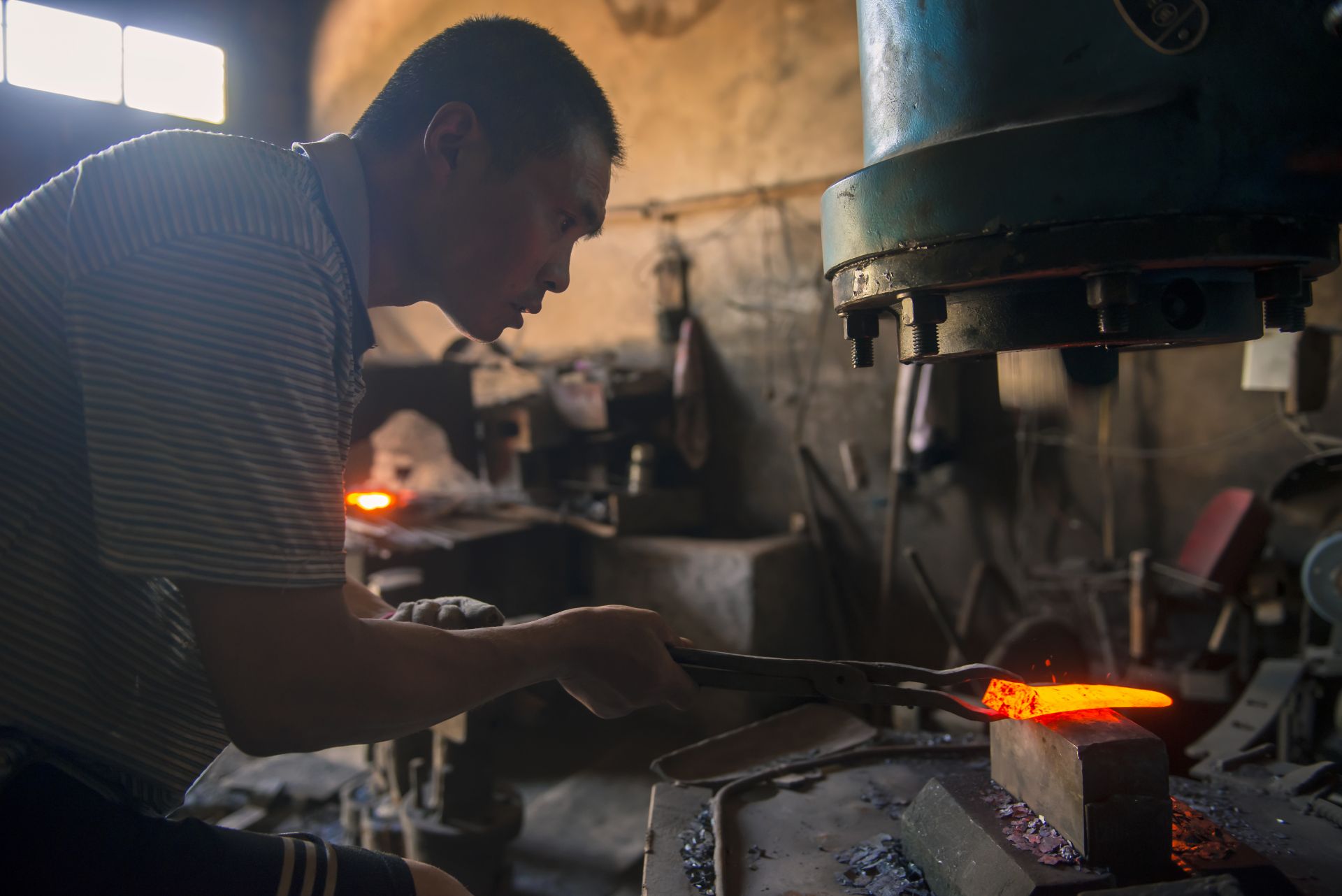 上世纪50年代,国家实行工商业社会主义改造,公私合营。三里成立“三里铁业社”,1953年李宗成率队参加全县打铁比赛,斩获全县第一名,由此,“三里铁业社”名声鹊起。 一把手工打造的菜刀需要经过30多次淬火,不断锤打,把杂质给砸出来,然后一遍一遍打磨。李正兵说,各种铁器,尽管外形好看,如果淬火技术不过关,就是中看不中用。要不就是钢火硬了容易缺口;要不就是钢火软了容易卷口。或者说,铁匠们锤炼的不仅是铁坯,也是对自身的千锤百炼,他们忍受着炉火炙烤、铁屑烫身,锤炼着力与巧、勇与毅。
